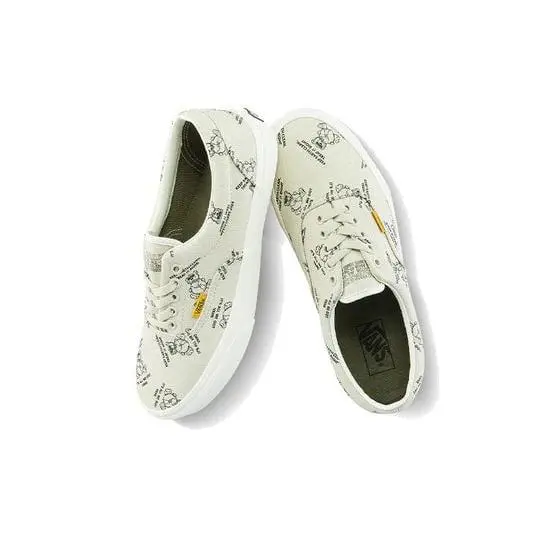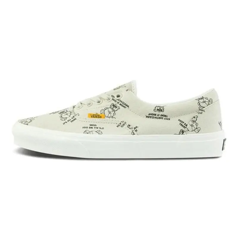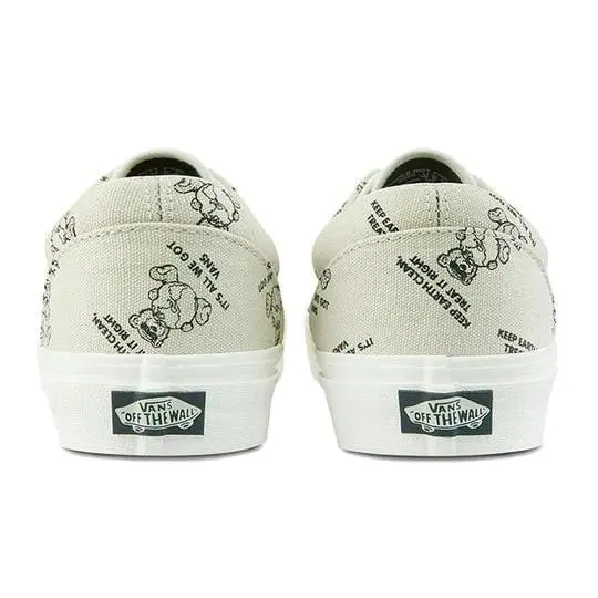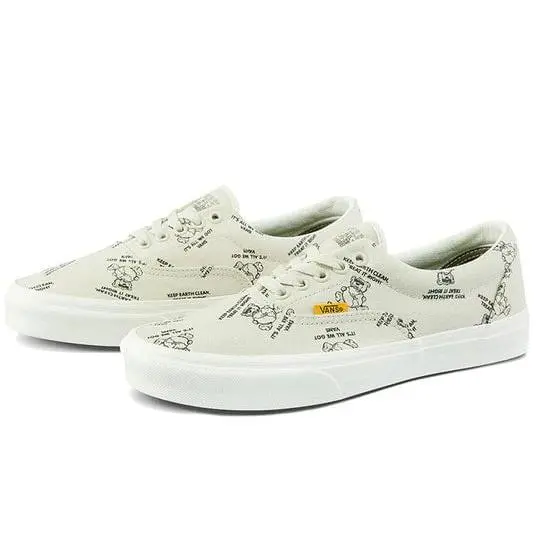 Spread a positive message of eco-friendliness with the Era World Code oatmeal and marshmallow skate shoes from Vans! These unique shoes feature a grey-tan canvas upper, sporting repeating bear-hugging-the-earth graphics, each surrounded by text reading "Keep earth clean, treat it right, it's all we got". With a cushioned footbed and off-white foxing to complement the oatmeal-colored upper, these striking sneakers are a fashion-forward way to spread an environmentally conscious message on your feet.