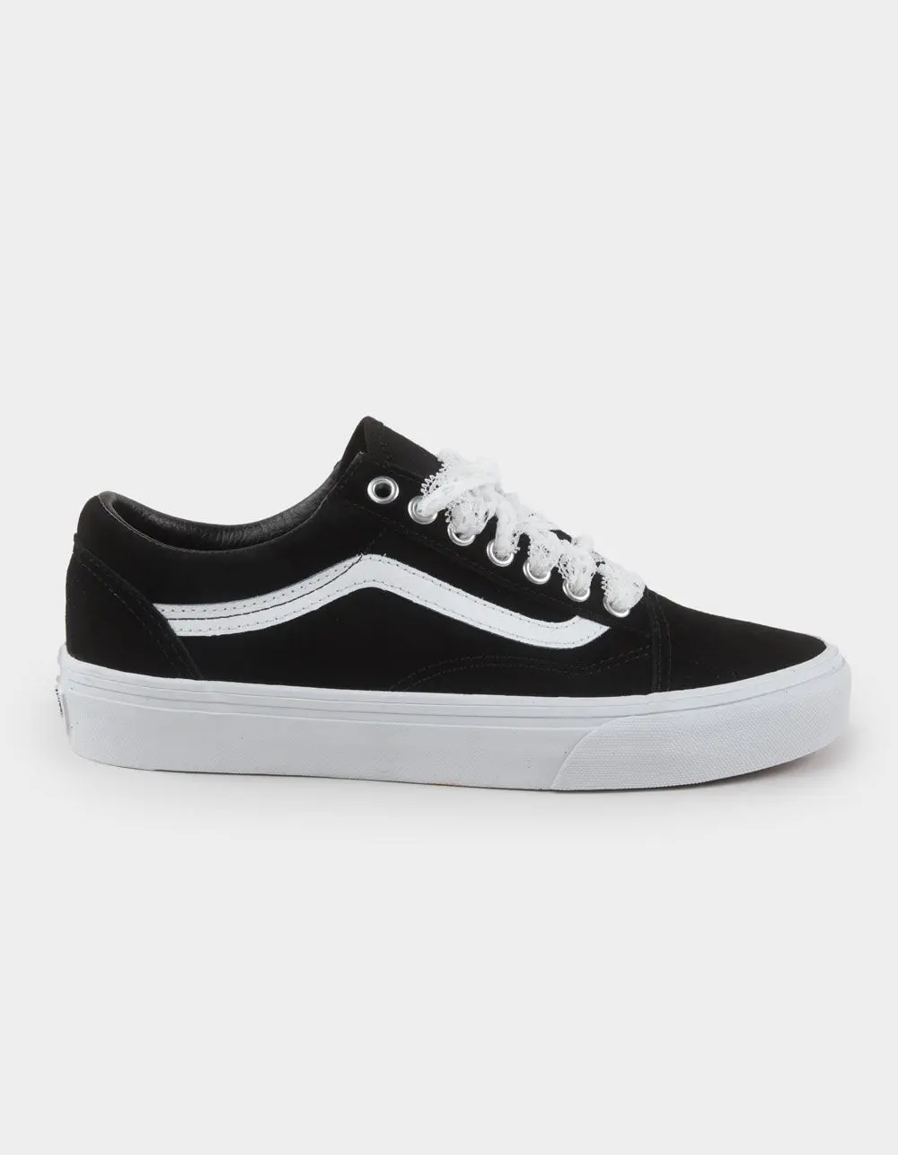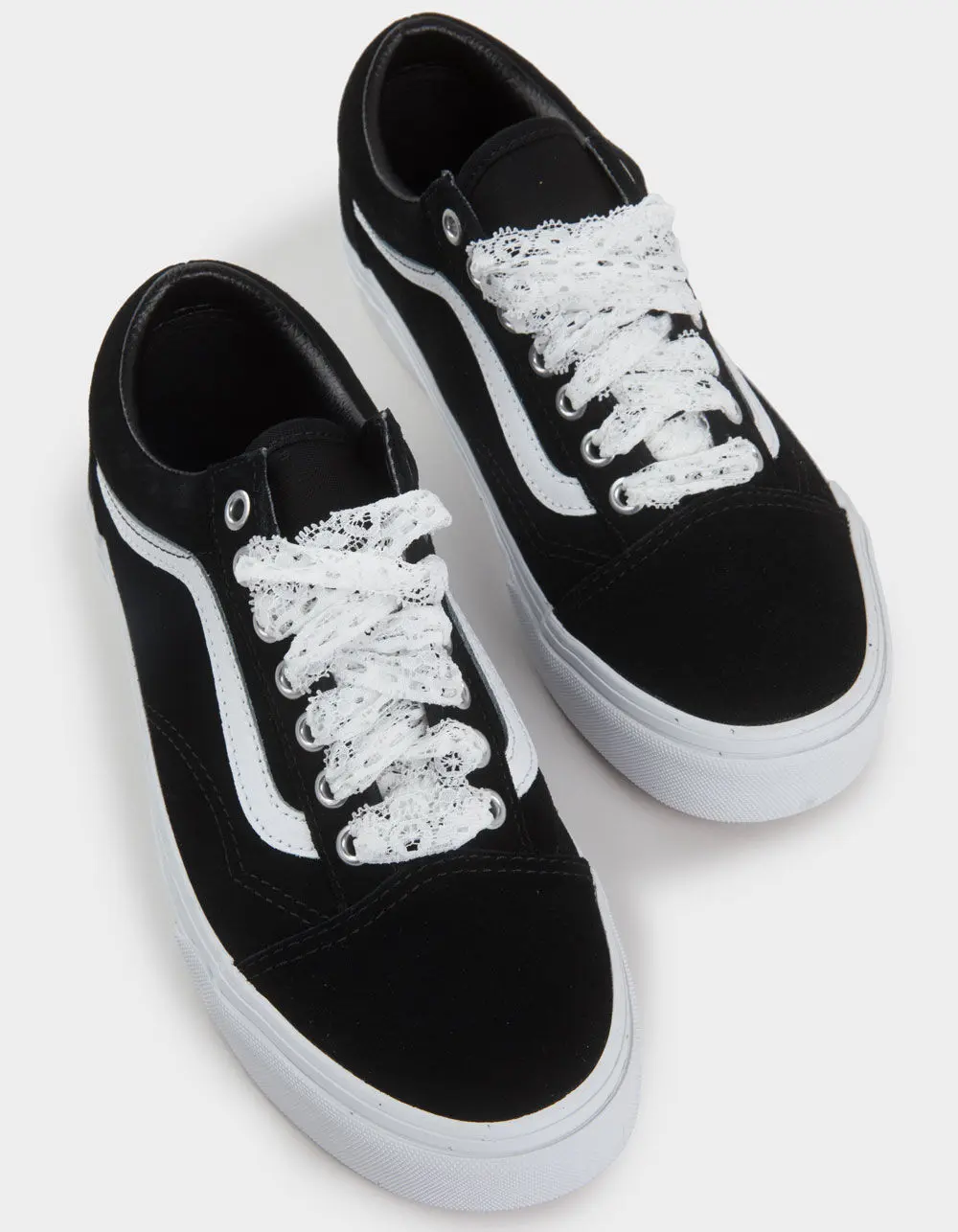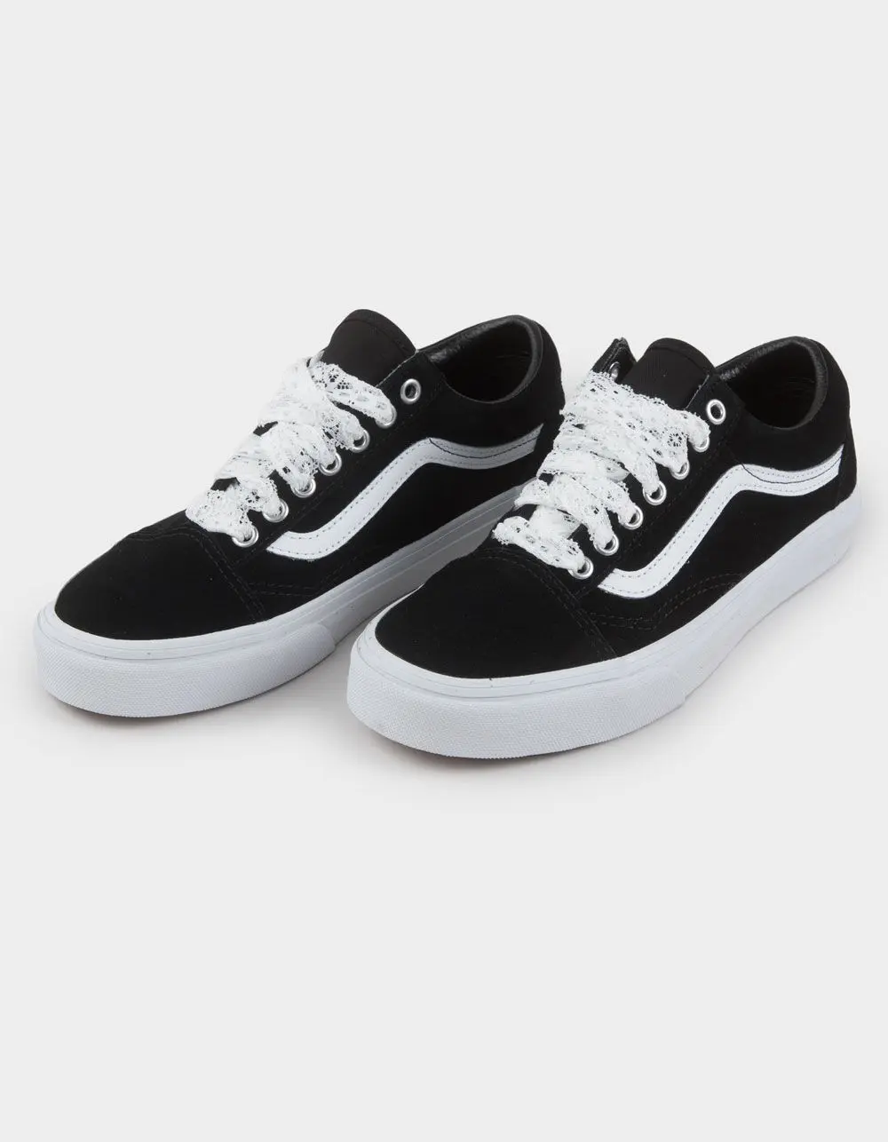 Vans Old Skool Pop Lace Shoes. Classic Old Skool's with delicate lace shoelaces. The Old Skool has never been lacking in the attitude department. It brought the dawn of the classic Vans side stripe that has developed into a status symbol of tradition and skate stature. Aside from all that personality, they have lasted as long as they have because of their ability to perform on a skateboard, and to last, and last. Canvas upper. Padded collar. Rubber waffle outsole. Imported.