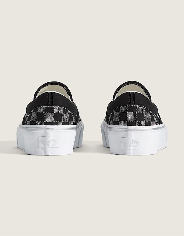 Vans Classic Slip-On Checkerboard Platform Shoes. The Classic Slip-On Platform refreshes Vans' original slip-on silhouette with an even chunkier take on the platform aesthetic. Constructed with an exaggerated sidewall for double the height, this platform shoe amplifies a classic favorite while bringing a new Off the Wall style to your look. 34mm platform height. Canvas upper for a classic look. Padded collar for support and comfort. Elastic side panels for easy slip-on and off. Rubber sidewall with classic foxing stripe. Vulcanized build for the original look and feel. Imported.