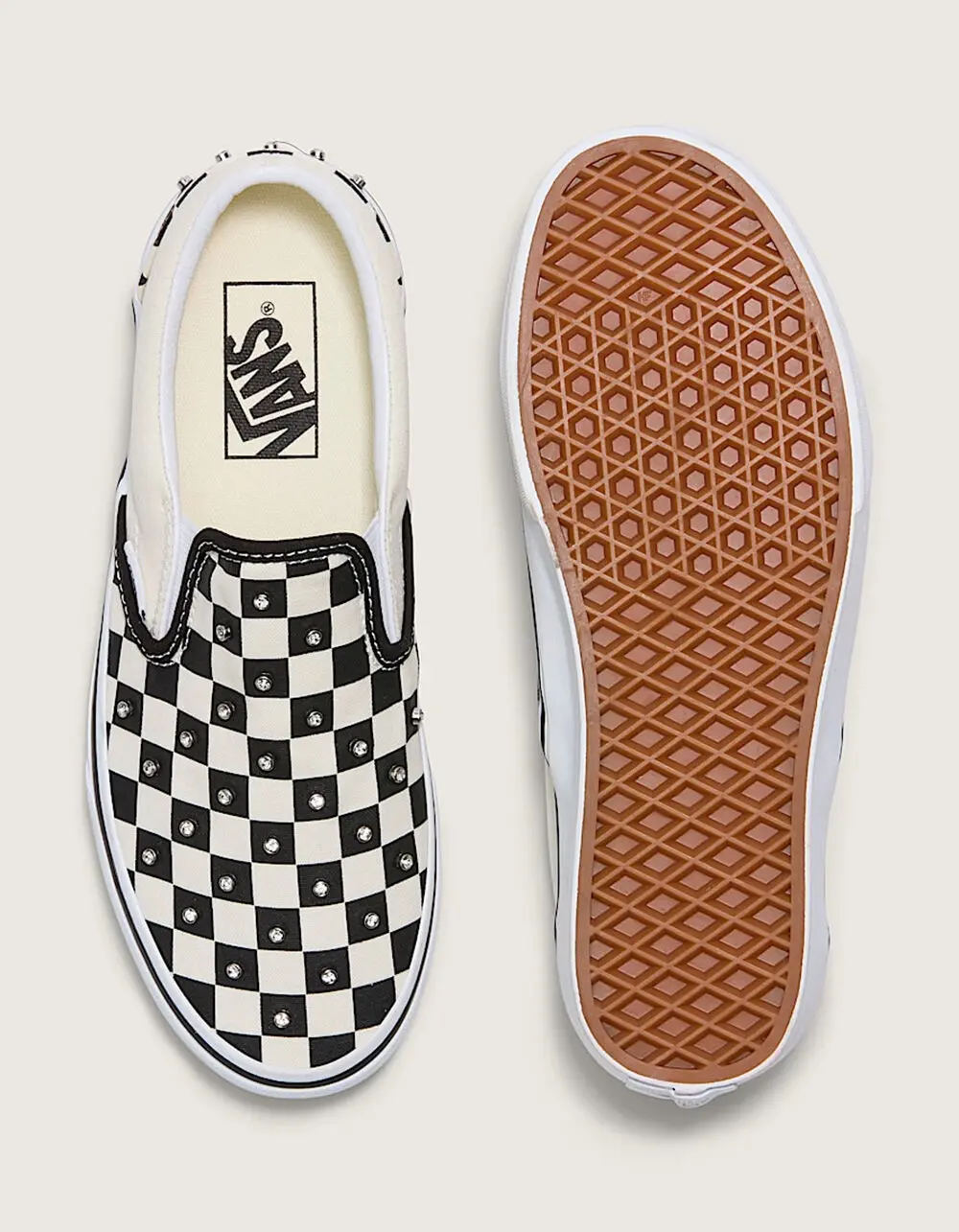 Vans Rhinestone Classic Checkerboard Womens Slip-On Shoes. The Slip-On Checkerboard Shoe, originally Style 98, evolved from a Vans boat shoe into a skateboarding classic. With its padded collar, grippy waffle outsole, and laceless upper, it embodies effortless style and function. Allover rhinestone details. Canvas upper for a durable and classic look. Padded collar for enhanced support and comfort. Elastic side panels give a comfortable easy on-and-off fit. Durable rubber sidewall with classic foxing stripe. Reinforced toe bumper for heavy wear and tear. Vulcanized sole for superior board feel and flexibility. Imported.