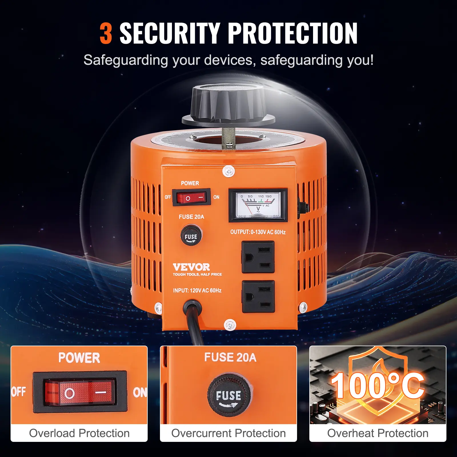 • Multiple Security Protections: Our variable voltage transformer is engineered with your security in mind, featuring fuses, a thermal control switch, and a resettable overload protector, extending uninterrupted protection to your equipment. Ideal for both household and industrial applications, our transformer creates a secure and stable voltage environment for all your devices.