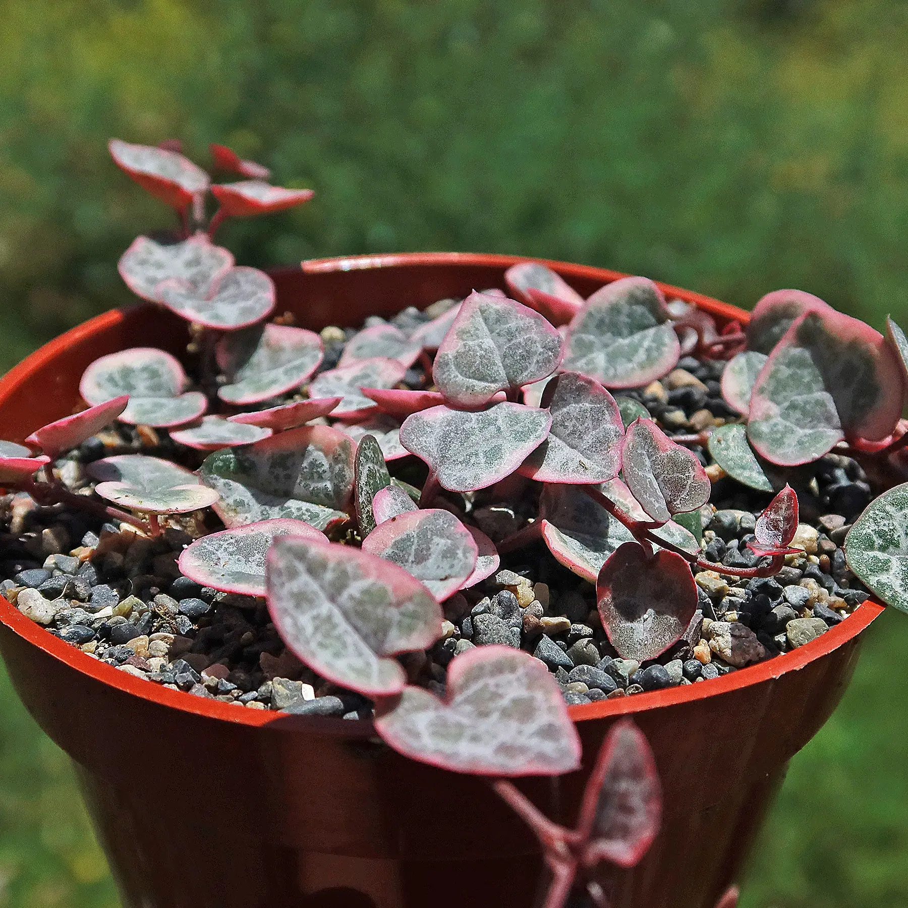 The hearts on a string are dark green with pink and silver variegation or creamy-white variegation, making them stand out even more.