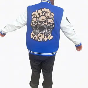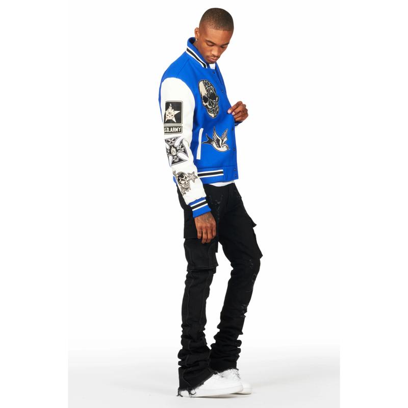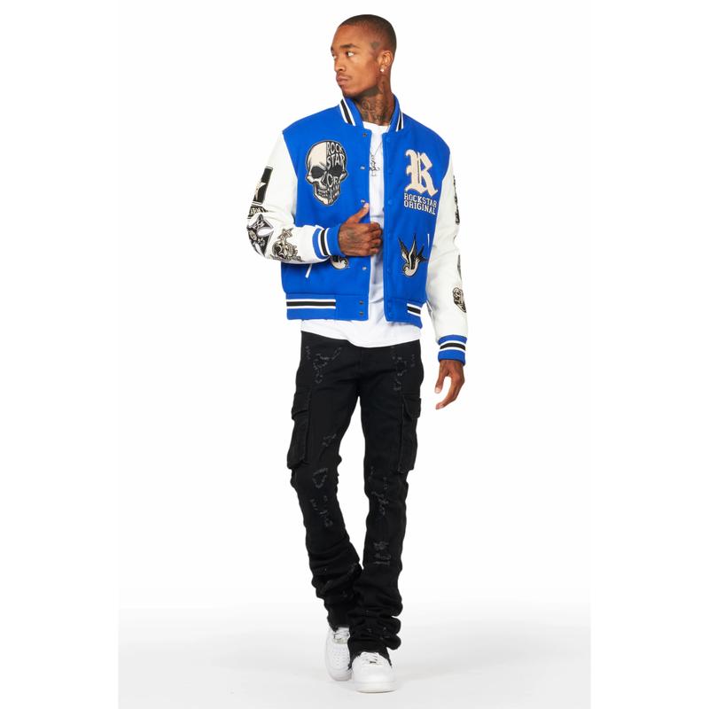 An urban collegiate varsity jacket for men in royal. Designed with an ultra soft fleece body and contrast faux leather sleeves for a dope outerwear style.