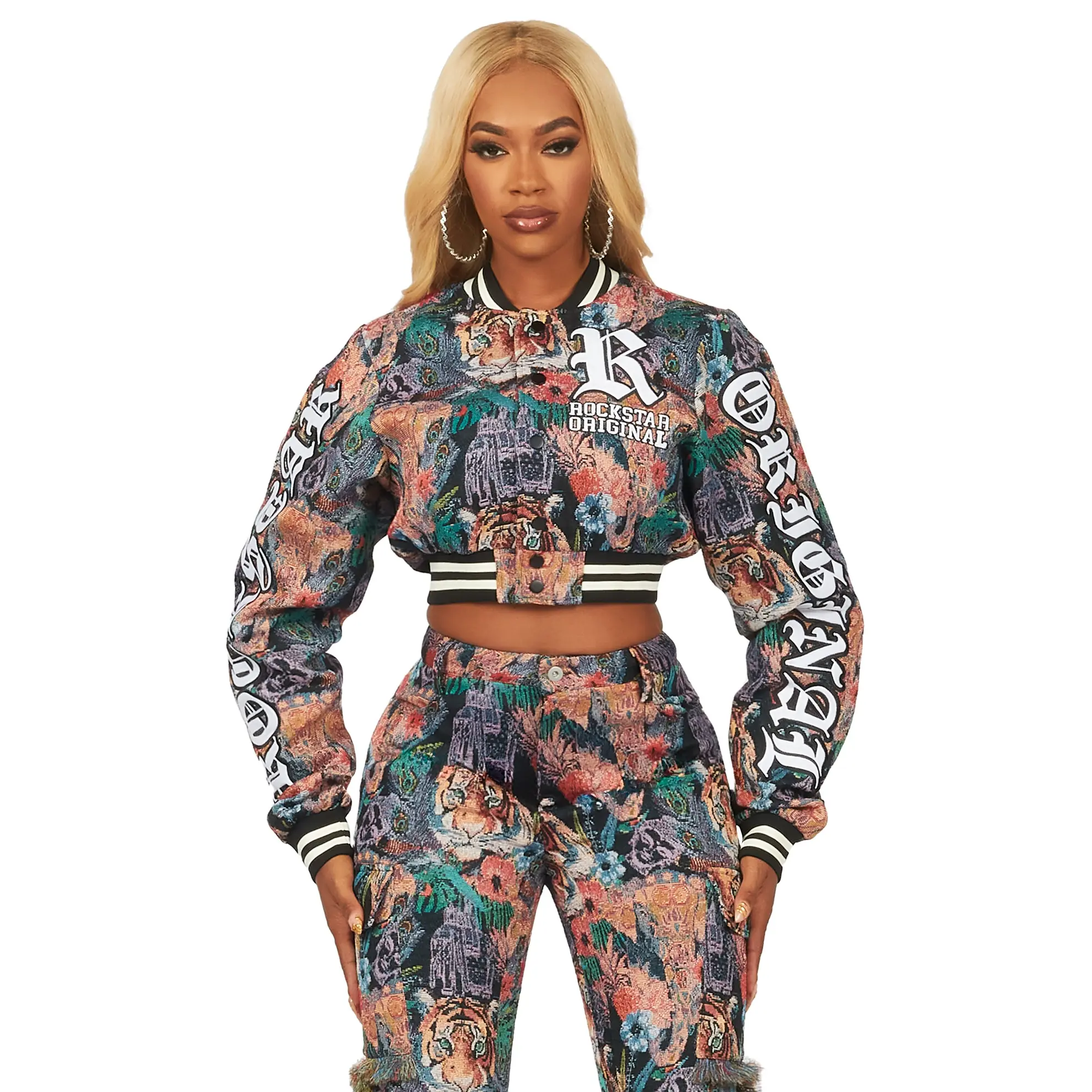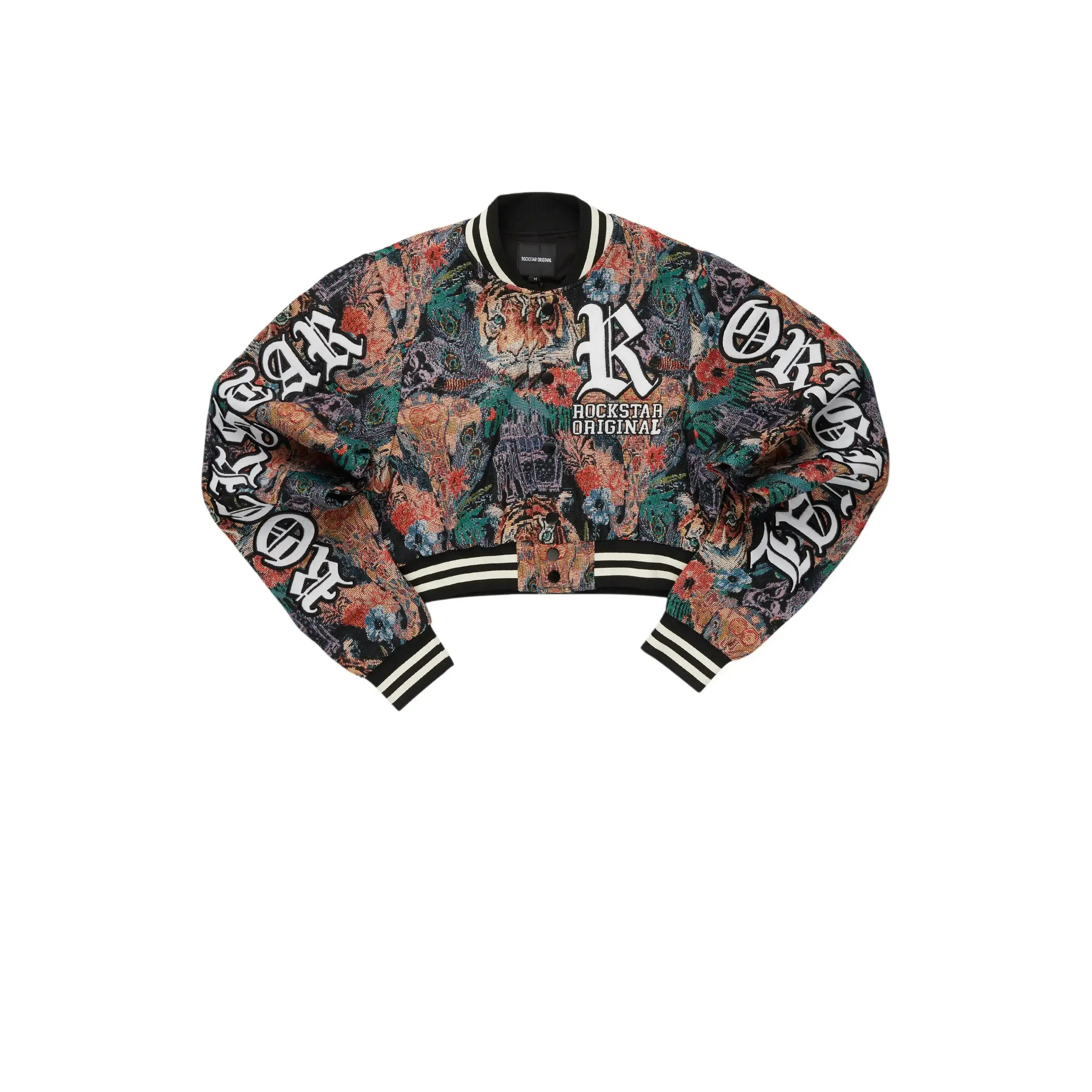 Khadiyah Black Crop Tapestry Varsity Jacket
