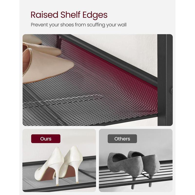 ·[Holds More Shoes] This 4 tier shoe rack can hold 12-15 pairs of shoes with the top board; the distance between each of the 3 mesh shelves is 8" to fit heels and high tops on the shelves