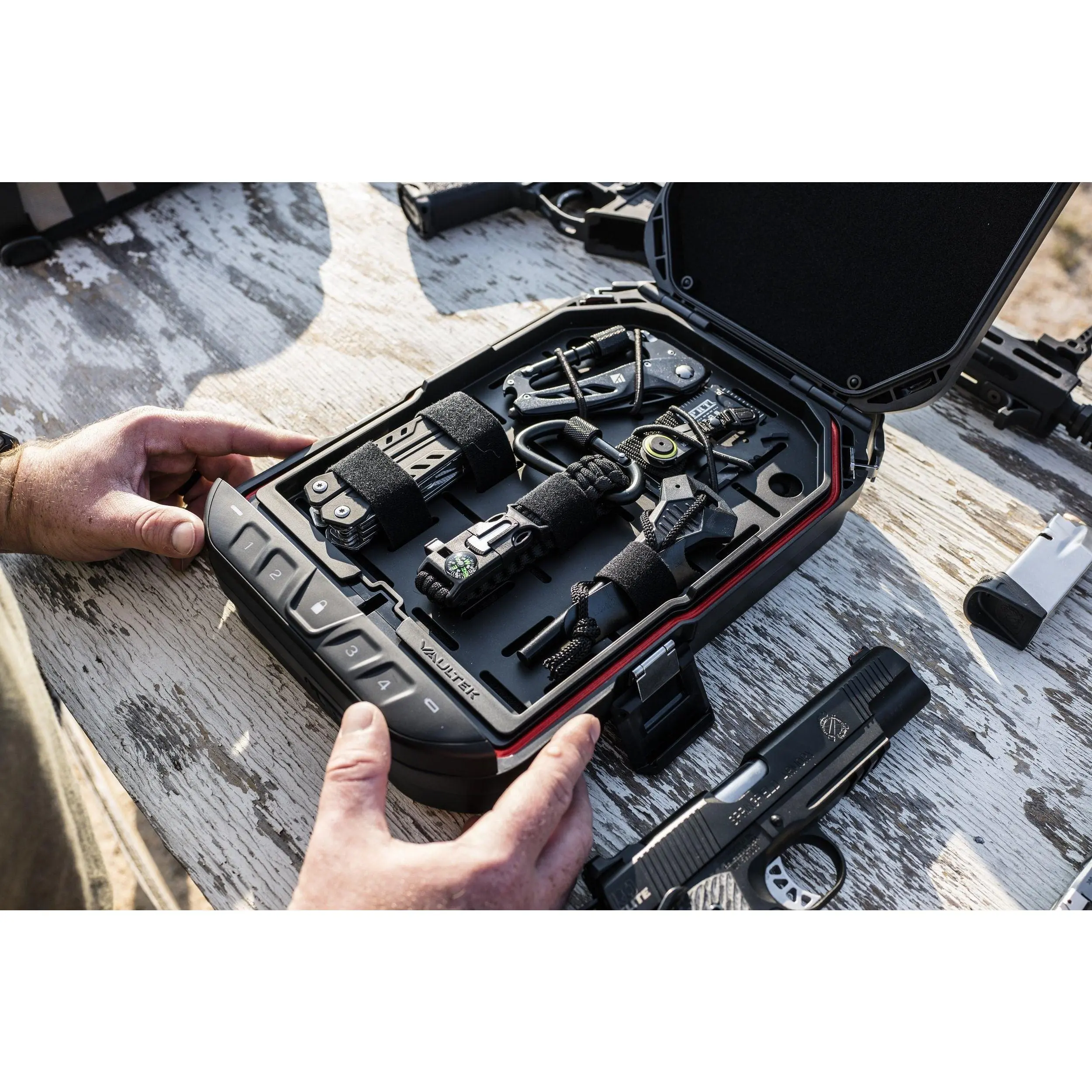 Vaultek has designed special proprietary material for the LifePod 2.0. This material is lightweight but was engineered for superior strength for the best in security protection. The dual side compression latches are combined with an interior rubber gasket that seals off the interior from environmental factors including water and dust. The LifePod 2.0 is water-resistant and is submersible in 3 feet of water for up to 30 minutes, airtight, dustproof, and will float.