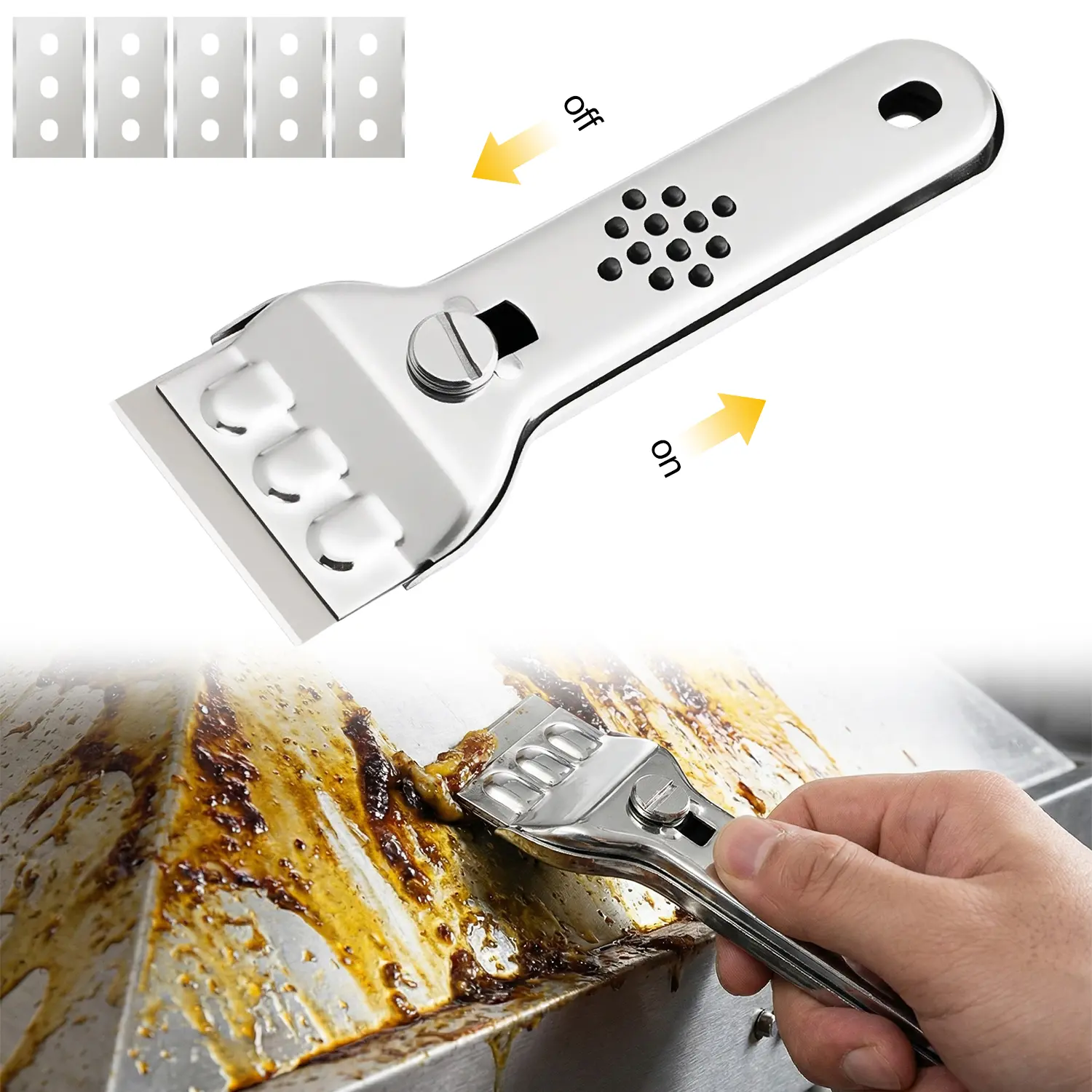 This multifunctional cleaning tool is perfect for windows, cooktops, ovens, glass, stoves, kitchen floors, and doors. It features 5 blades for efficient removal of sticky residue, tile, wallpaper decals, labels, caulk, adhesive, paint, and glue. Made from stainless steel, it ensures durability and longevity. 🏠