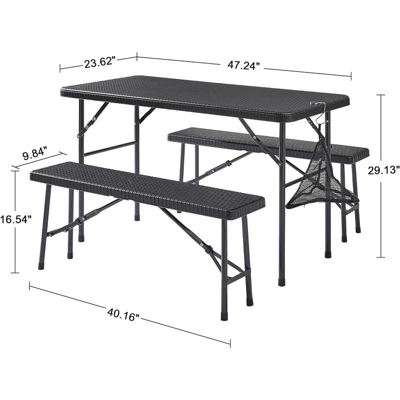 Color Black Brand VECELO Size 3 Piece Shape Rectangular Item Weight 35 Pounds Assembly Required No Item Dimensions LxWxH 47.2 x 24 x 29.1 inches About this item [Multifunctional Dining Table] -- This dining table set is made of woven faux rattan and has a modern and stylish look that makes it complement any home decor. You can enjoy good time with your family and friends on this dining table and chairs and feel the beauty and coziness of life. The kitchen dinette set can be used not only in the dining room and living room, but also in the patio and garden as an outdoor table set. [Portable and Space-saving] -- The folding design of this dining table set allows for quick and easy storage. When folded, the table measures 47.2 x 24 x 1.57 inches and the benches measure 40.2 x 10 x 1.54 inches. You can easily place it in the pantry when not in use to free up more interior space. It is a great solution for small spaces such as small apartments, kitchenettes and studio apartments. [Durable and Easy to Clean] -- This dining room table set with chairs for 4 is highly rust, water, and abrasion resistant.The metal frame is coated with a rust-resistant coating that provides added protection and durability to this dining set. The table and chair tops are also made of waterproof HDPE material, providing great support while being easy to clean. [Reinforced Sturdy Structure] -- The dinette table with chairs set are constructed from heavy-duty , metal frames with snap-lock mechanisms for stability during use. Every corner of this dining table set with benches are strengthened to upgrade its stability and looks very textured. When set up it can comfortably accommodate 4 people. Recommended weight capacities are 400 lbs for the table and 550 lbs per benches. [No Assembly Required] -- The dining room table set for 4 requires no assembly, taking just 20 seconds to fully unfold and be ready for use. [With a Mesh Bag] - For containing small items and keeping the tabletop tidy.