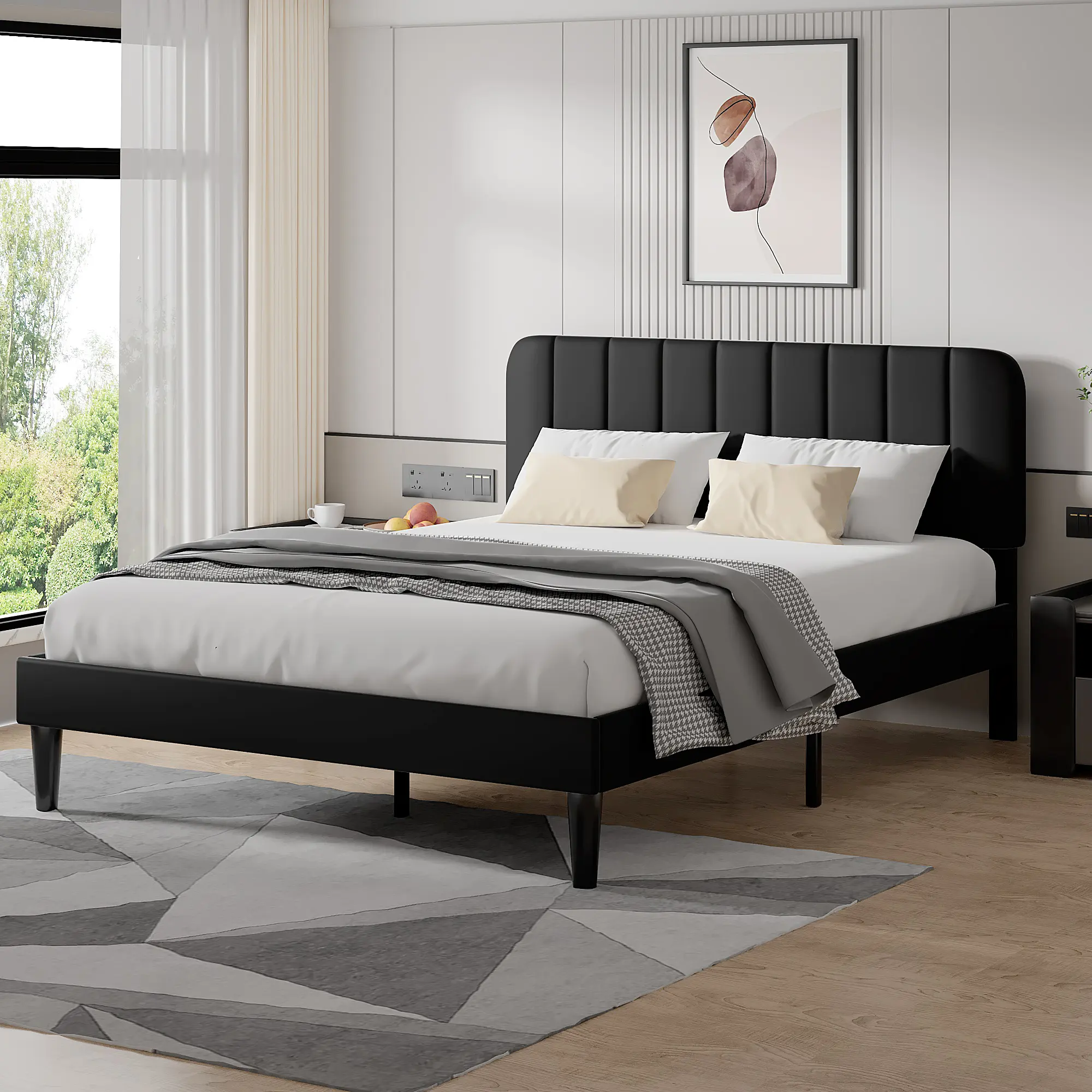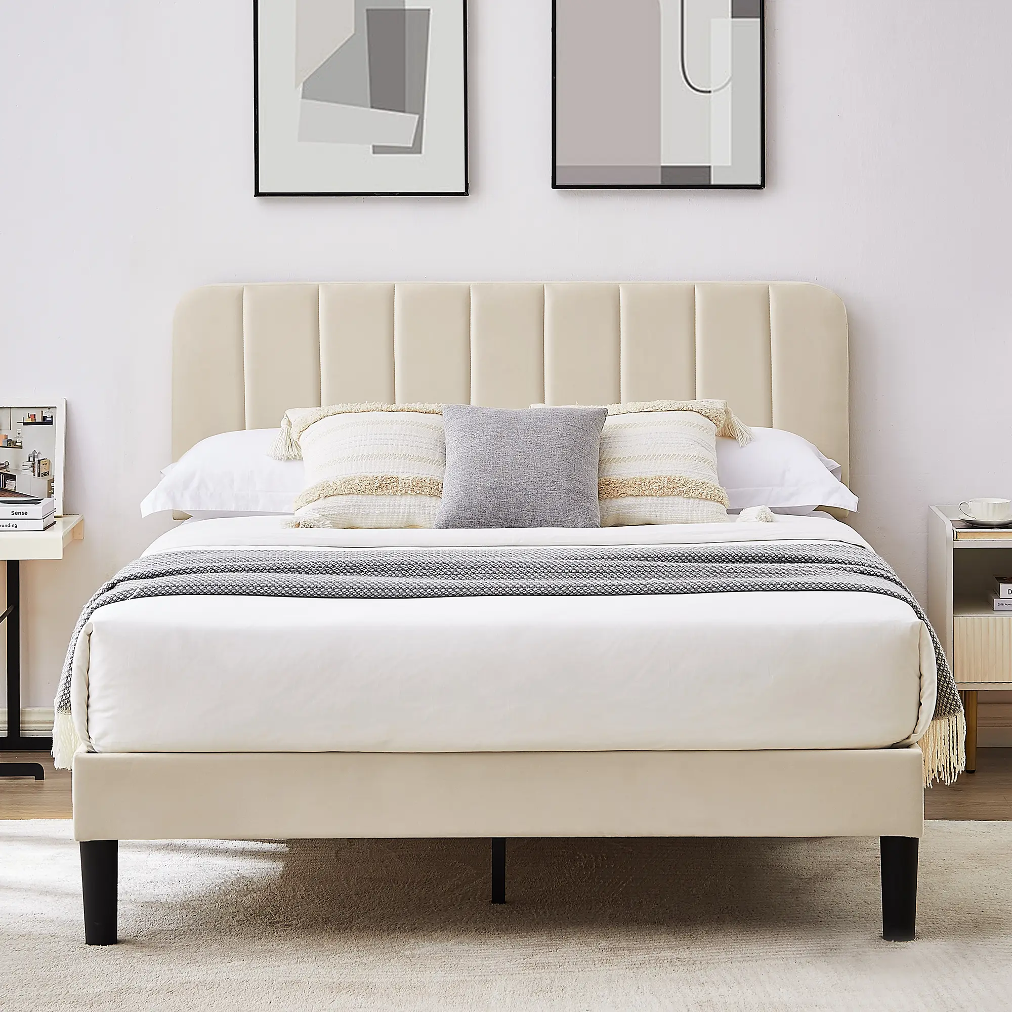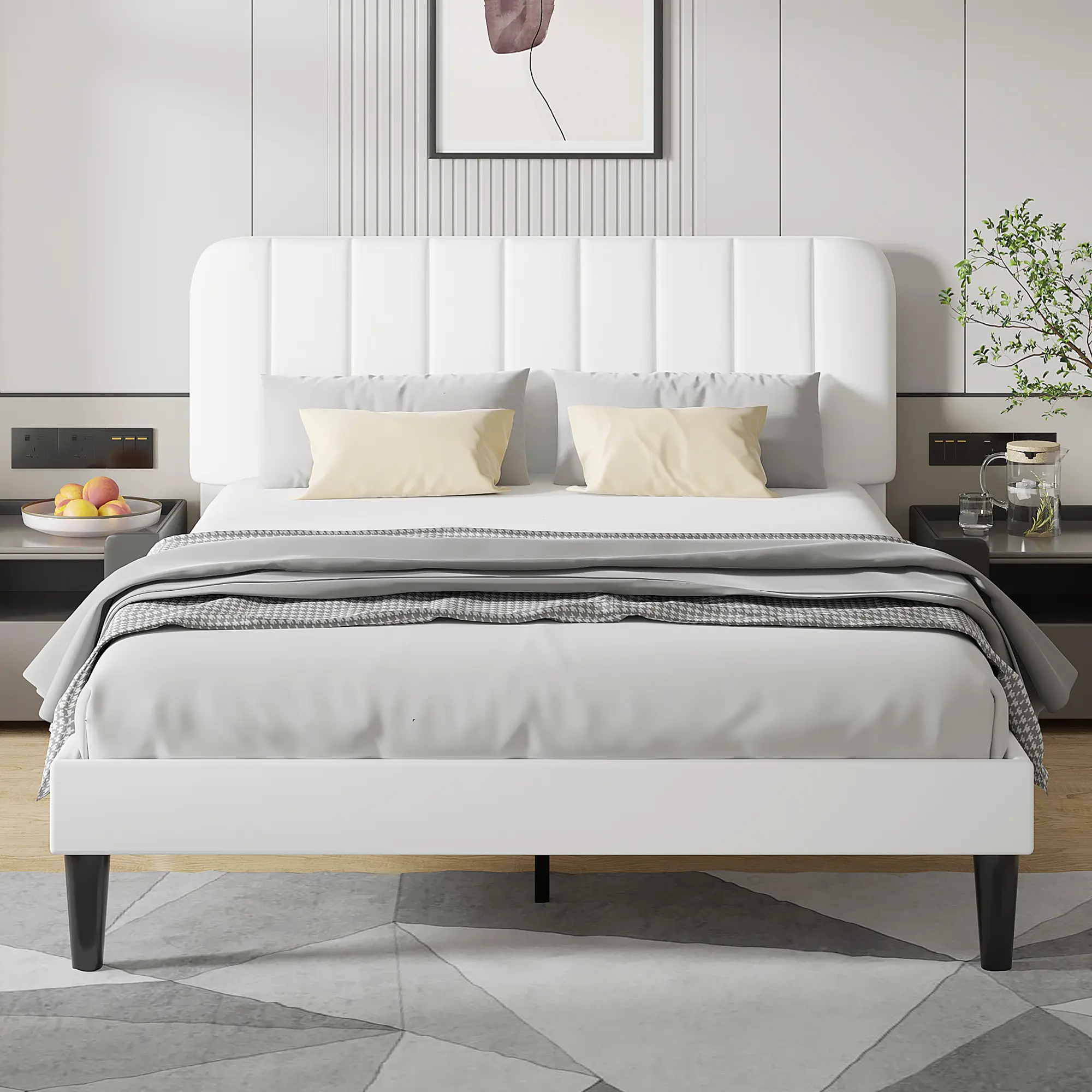【Elegant Design】Upholstered bed in classic design style, vertical stripes are more modern. Make your bedroom look more classic and gorgeous, bring a warm feeling to your bedroom.