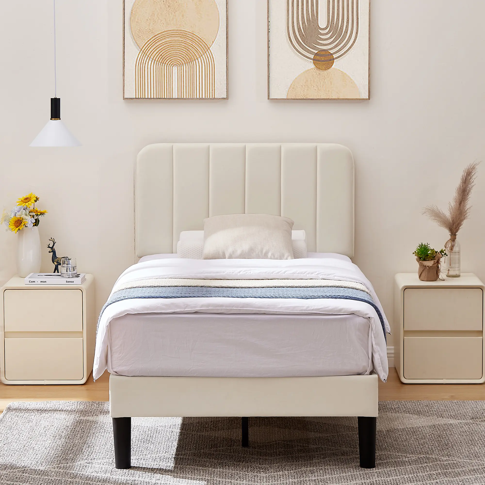 【Solid Construction】The upholstered platform bed provides dense and strong support as it contains 12 wooden slats and a metal frame. The support legs in the middle can prevent the mattress of the bed from sagging and prolong the life of the mattress.