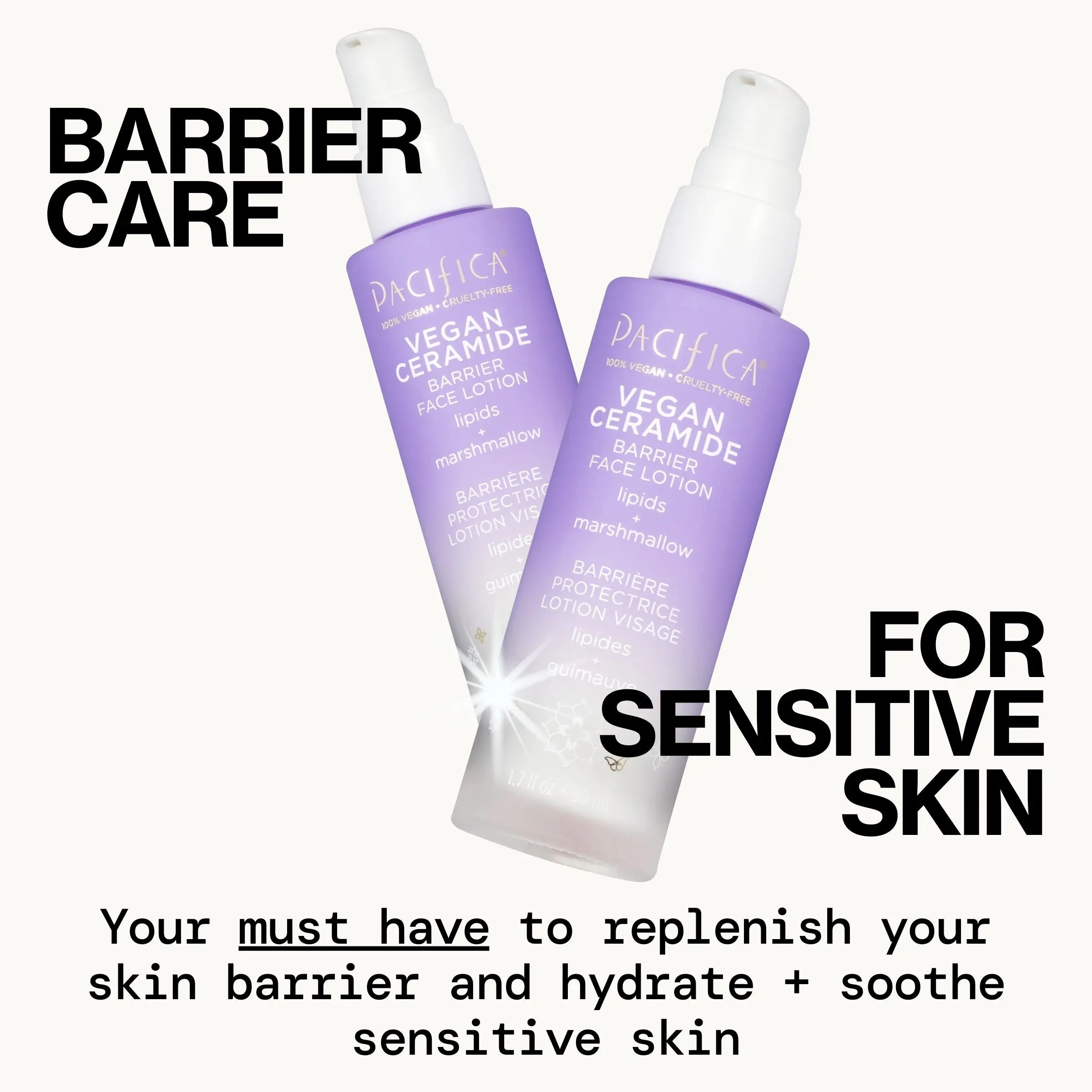 A revolution in barrier protection for the most sensitive skin. Our light weight fast-absorbing and fragrance-free Vegan Ceramide Lotion is dermatologist, sensitive skin and allergy-tested. Containing a synergistic lipid concentrate, this innovative formula is designed to hydrate, seal cracks and help prevent moisture loss. Marshmallow root and calendula target dryness.