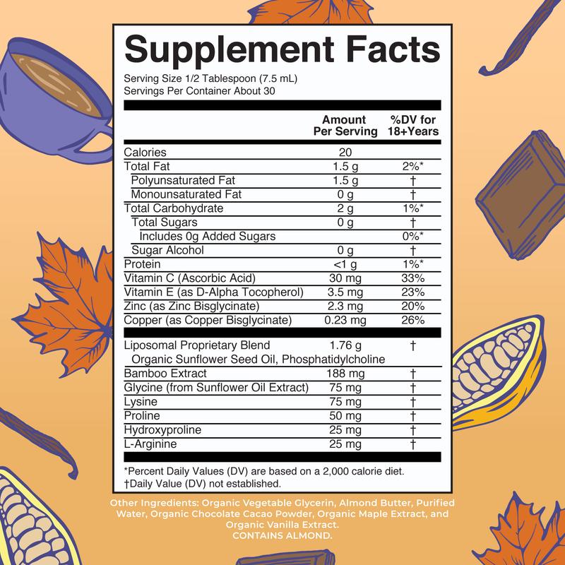 A delicious Maple Hot Cocoa flavored ultra absorption liposomal to support your body’s ability to make collagen! Our Vegan Collagen Booster Liposomal contains 5 amino acids as well as nutrients such as vitamins C & E, zinc, copper, and silica!
