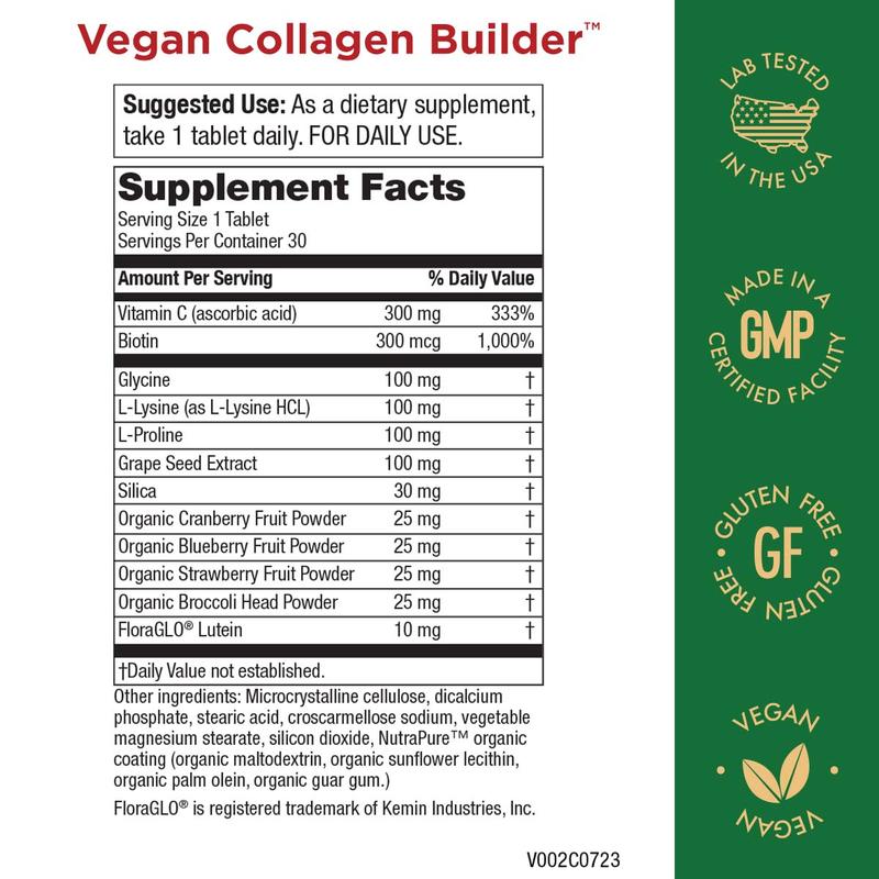 That’s why Vegan Collagen Builder starts off with 300 mg of Vitamin C — a key stimulator of collagen synthesis. Then it adds Biotin and Silica for healthy hair, skin, and nails.* We add to that three important Amino Acids from vegan sources: glycine, lysine and proline. The body uses these amino acids to build the sturdy and tough collagen fibers that keep your connective tissue strong.* Plus, Vegan Collagen Builder includes Grape seed extract for additional antioxidant power and support for the circulatory system.*