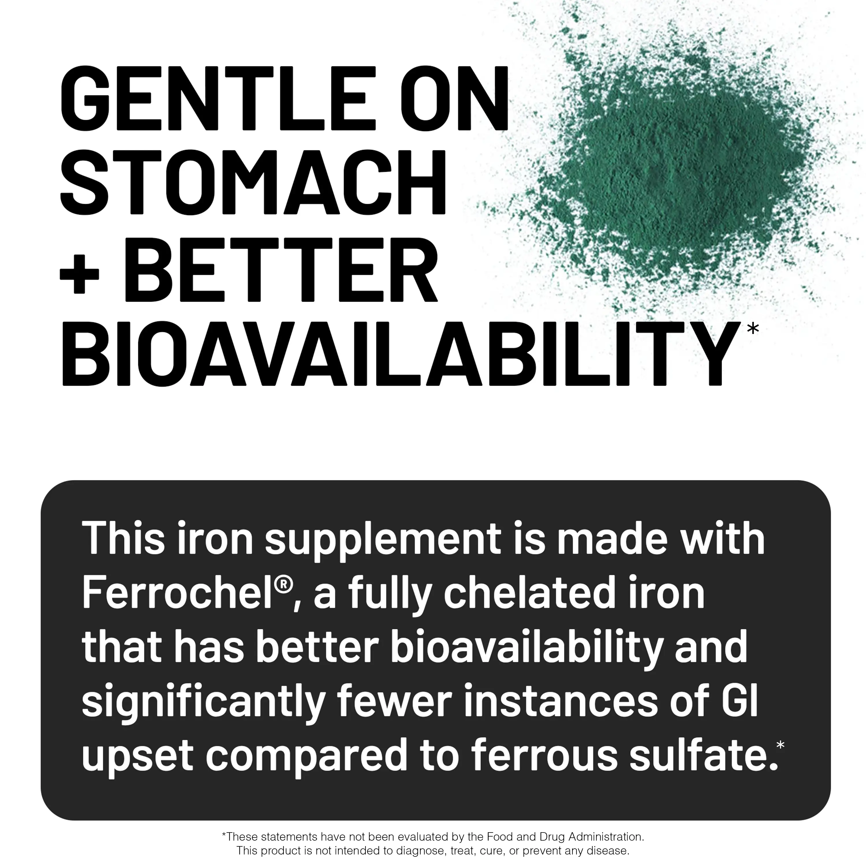 ·Gentle on Stomach: This iron supplement is made with Ferrochel, a fully chelated iron that is known to cause significantly fewer instances of GI upset compared to ferrous sulfate.*