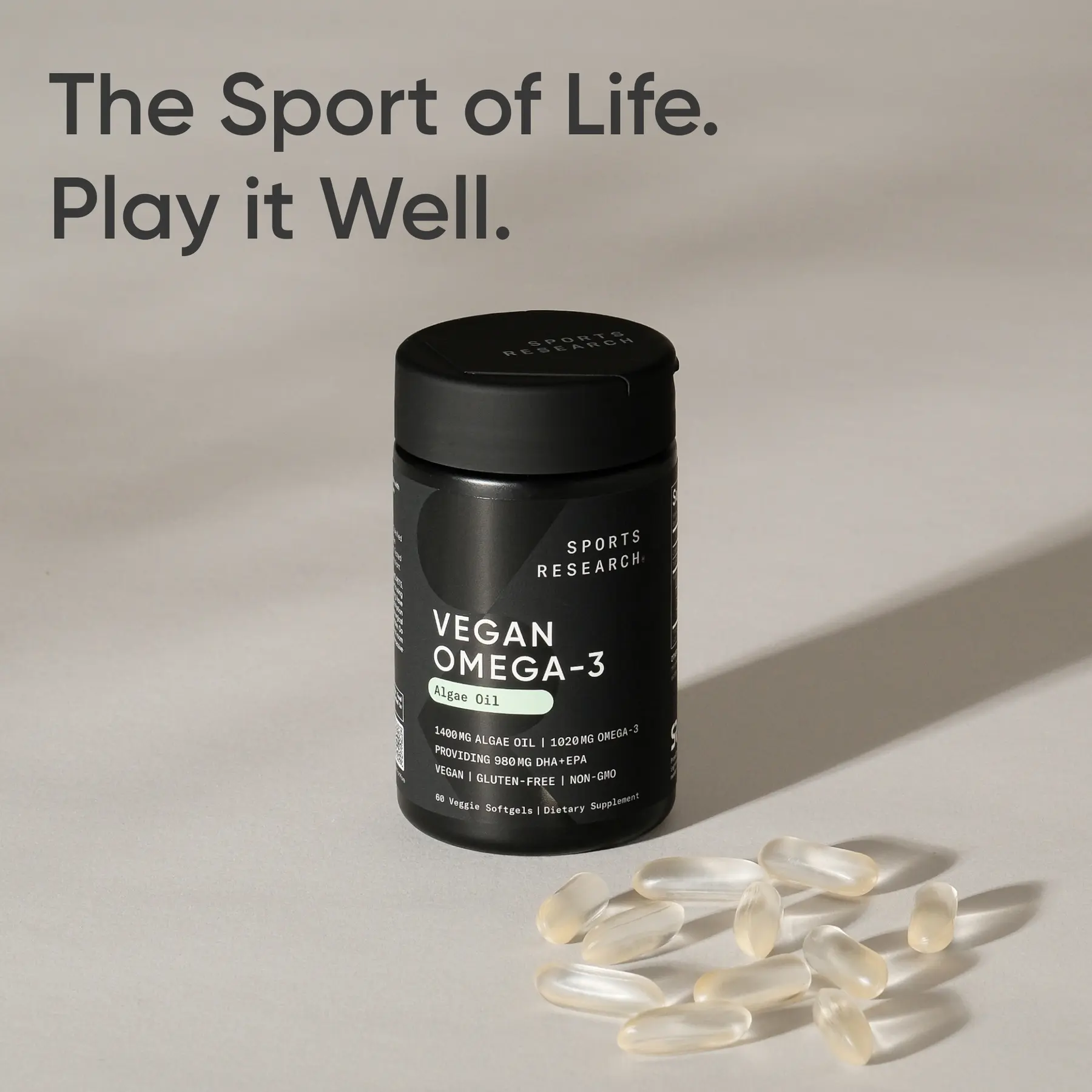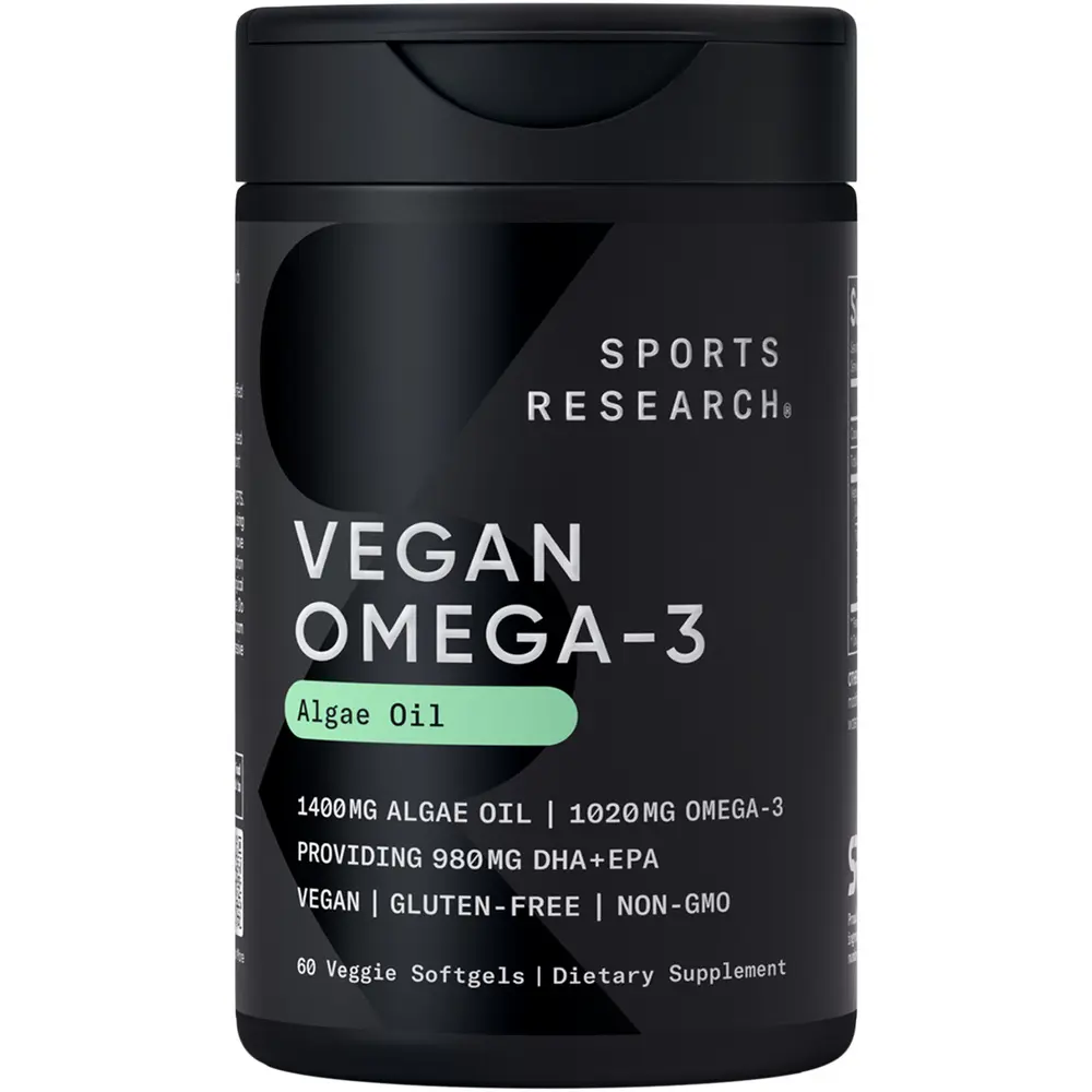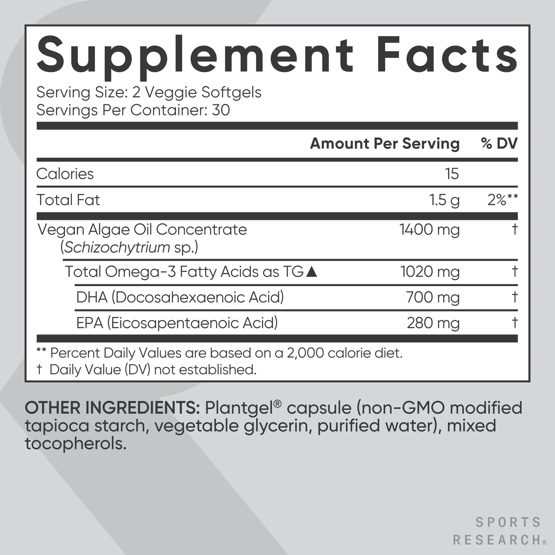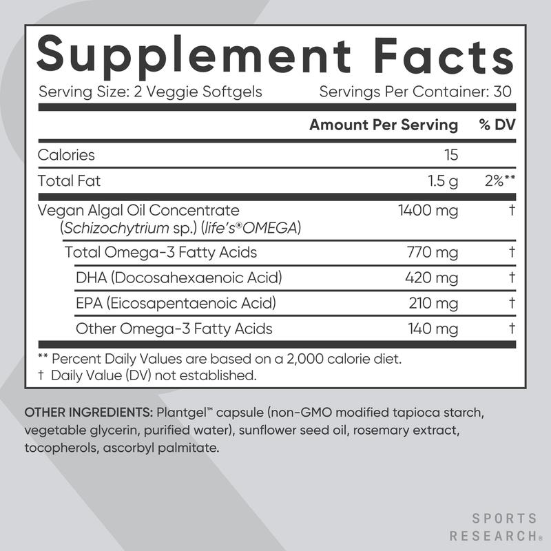 Sports Research Vegan Omega-3 is made from Algae Oil, offering 770 mg of Omega-3 per serving—including 210 mg of EPA and 420 mg of DHA in every carrageenan-free softgel.