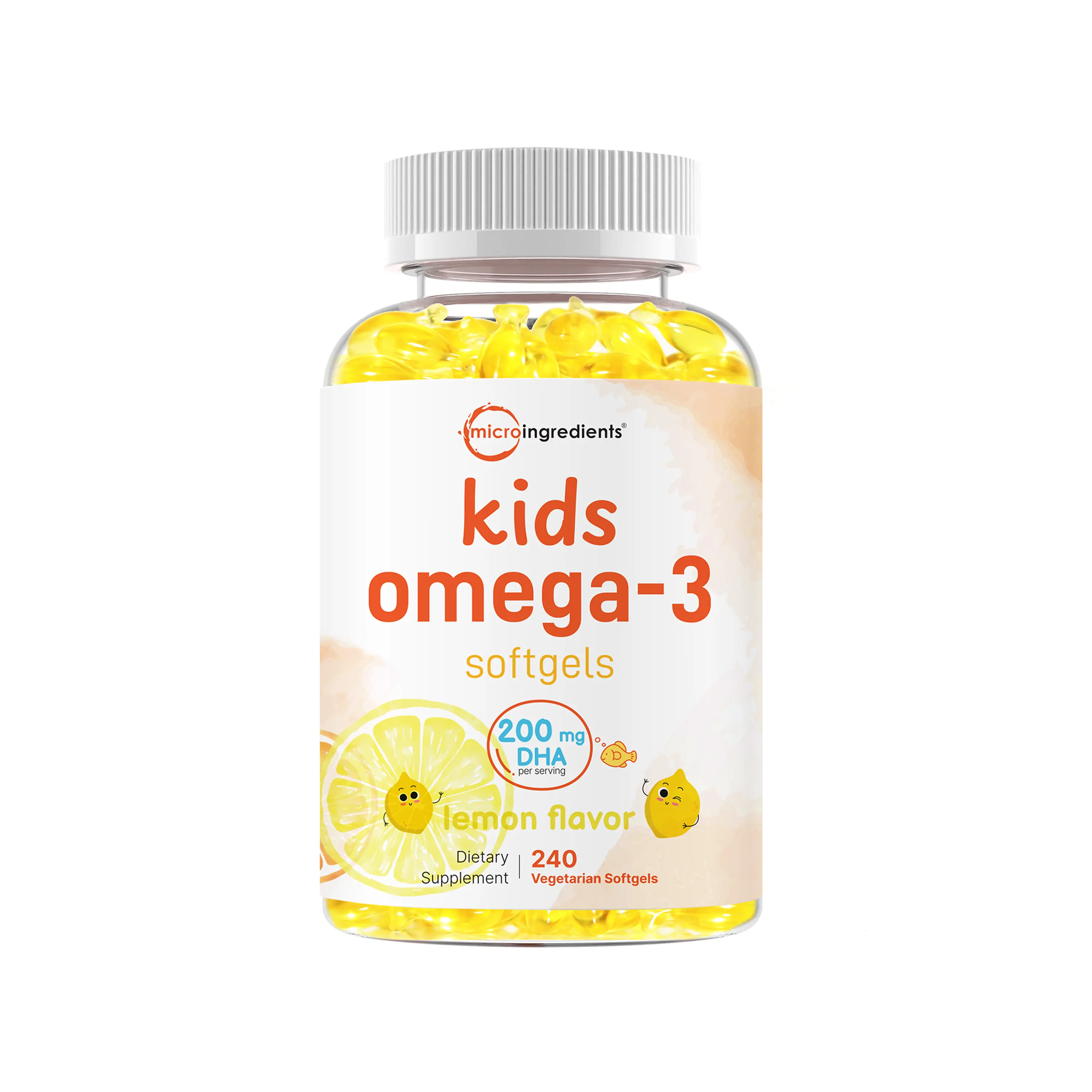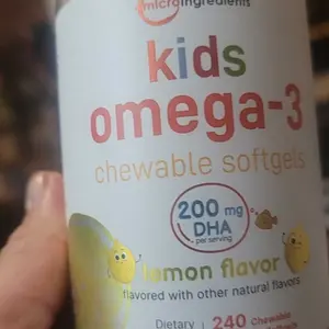 ·Micro Ingredients offers a vegan omega-3 softgel formula for kids, made with naturally occurring DHA sourced from plant-based algae oil. These vegetarian softgels feature a lemon flavor with no fishy taste or burps.