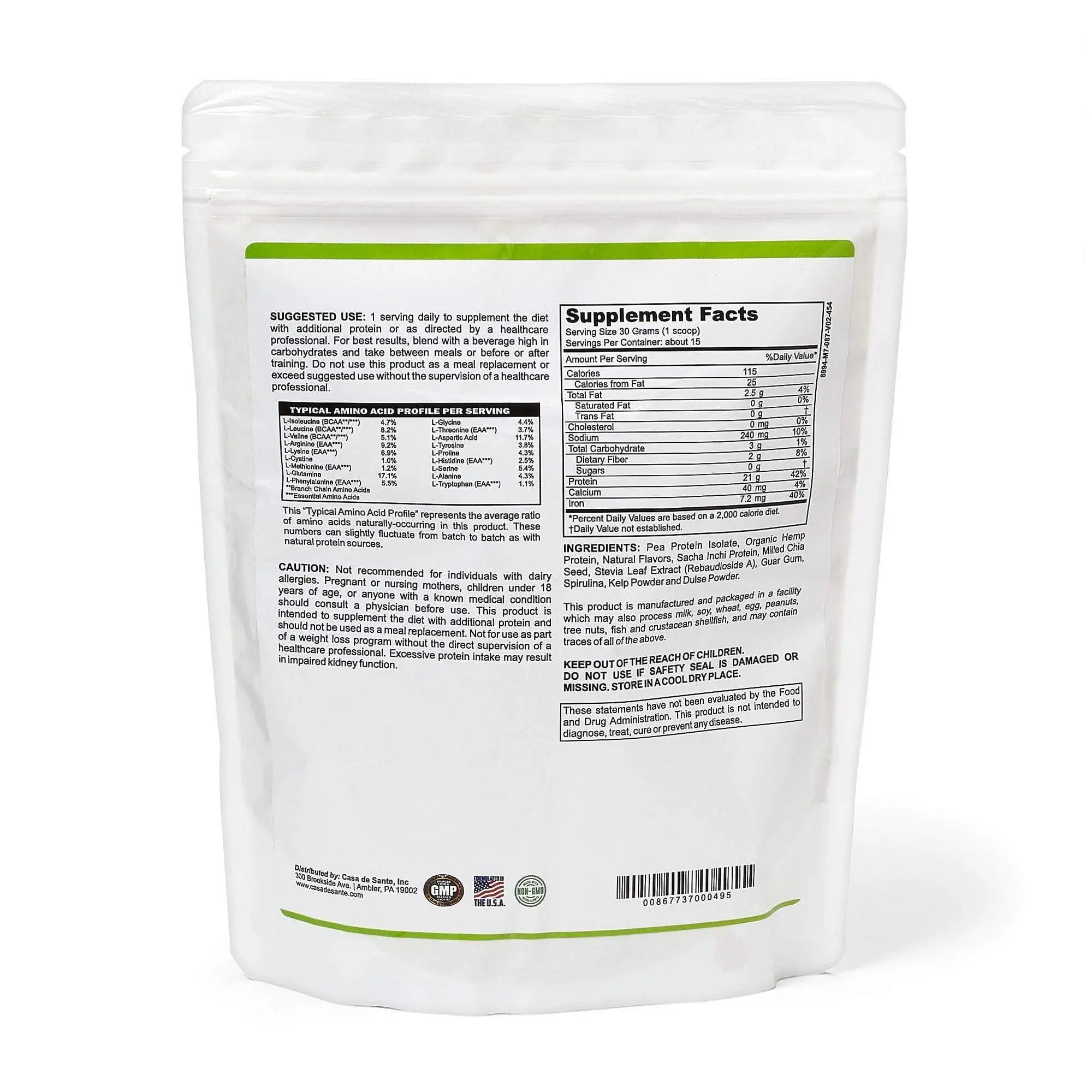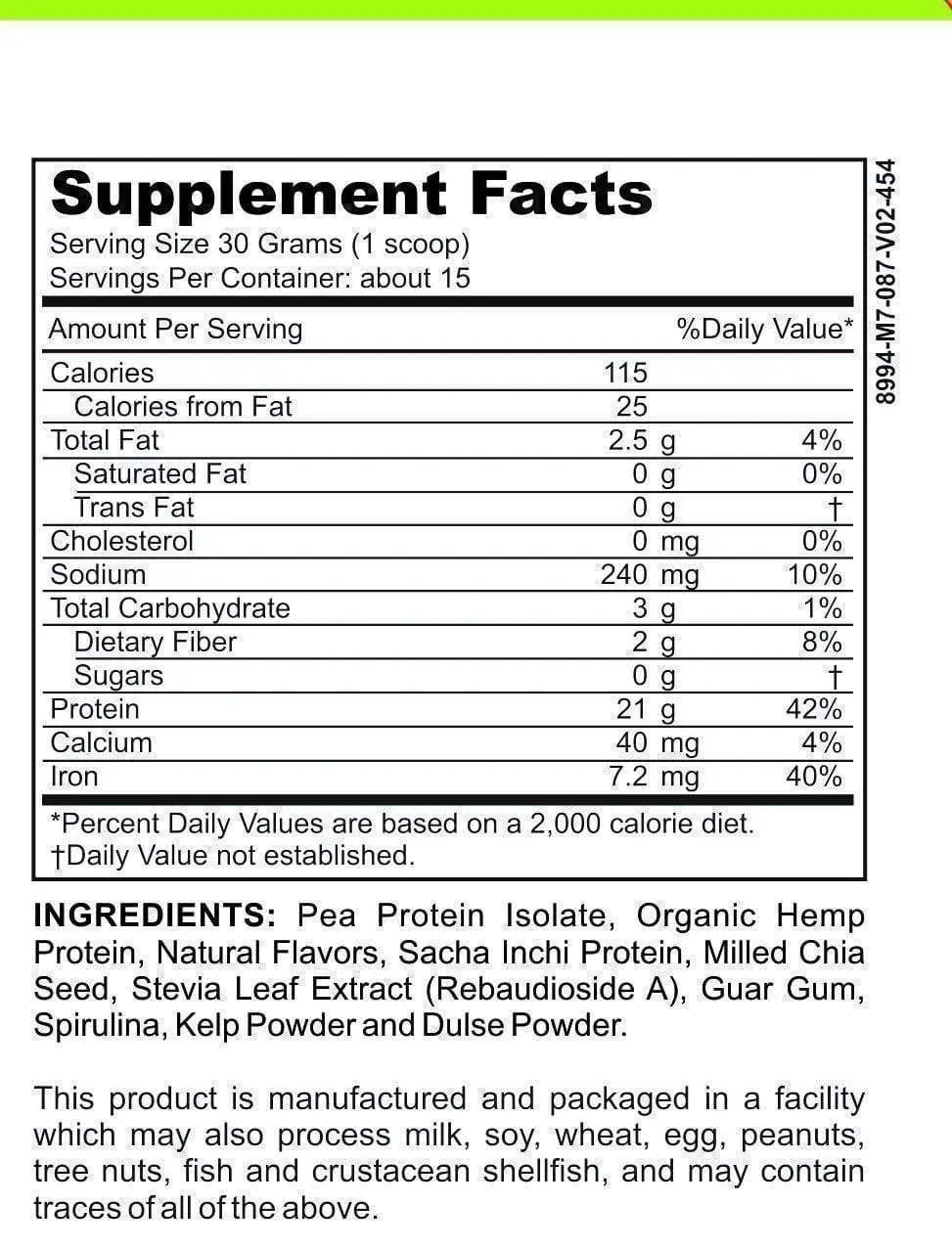 INGREDIENTS: Our low FODMAP certified vegan protein powder contains pea protein isolate, sacha inchi protein, natural flavors, guar gum, milled chia seed, spirulina, stevia leaf extract, kelp powder, dulse powder and more. Each ingredient plays an important part in the health benefits from using our protein powder.