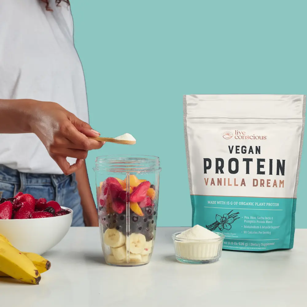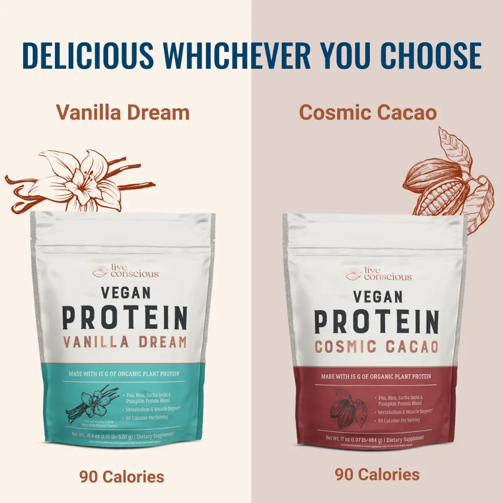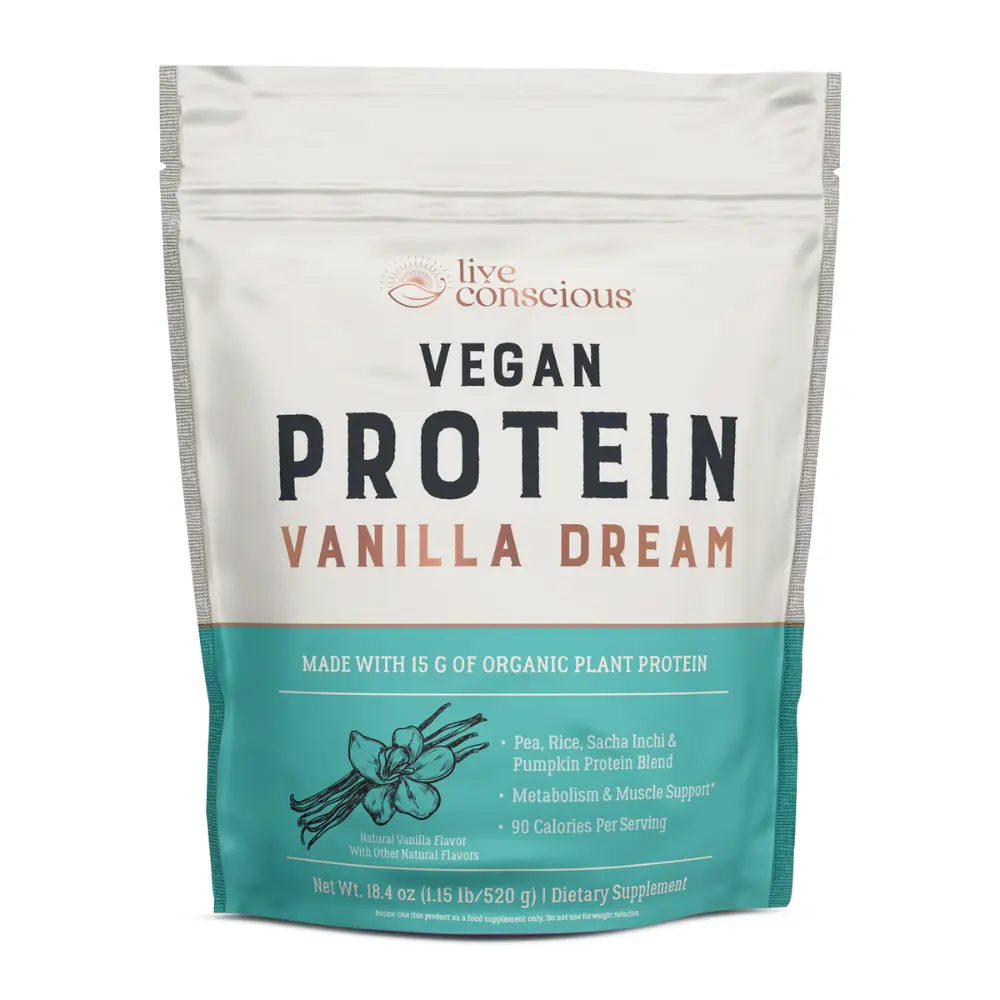 Sweet dreams are made of... vanilla! 🍦✨ Ready to fuel your body the plant-based way? Meet Live Conscious Vegan Protein in Vanilla Dream. This isn't just a protein shake; it's a delicious step toward your fitness goals. Each serving is packed with 15g of organic plant protein from a clean blend of pea, rice, sacha inchi, and pumpkin seeds. Whether you're looking for a post-workout recovery or a metabolism boost, this blend is designed for metabolism and muscle support—all while staying under 90 calories per serving. It’s smooth, creamy, and tastes like a dream! Ready to level up your nutrition? Grab a bag and start sipping on sunshine! ☀️💪 #LiveConscious #VeganProtein #PlantBasedPower #VanillaDream #CleanFuel