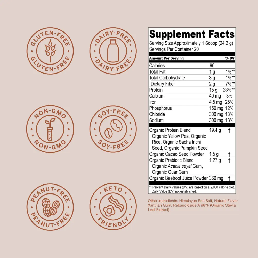 IngredientsOrganic Yellow Pea,Organic Brown Rice,Organic Sacha Inchi Seed (Plukenetia volubilis),Organic Pumpkin Seed,Organic Tahl Gum (Acacia seyal),Organic Guar Gum,Himalayan Sea Salt,Xanthan Gum,Rebaudioside A 98% (Organic Stevia Leaf Extract),Malic Acid