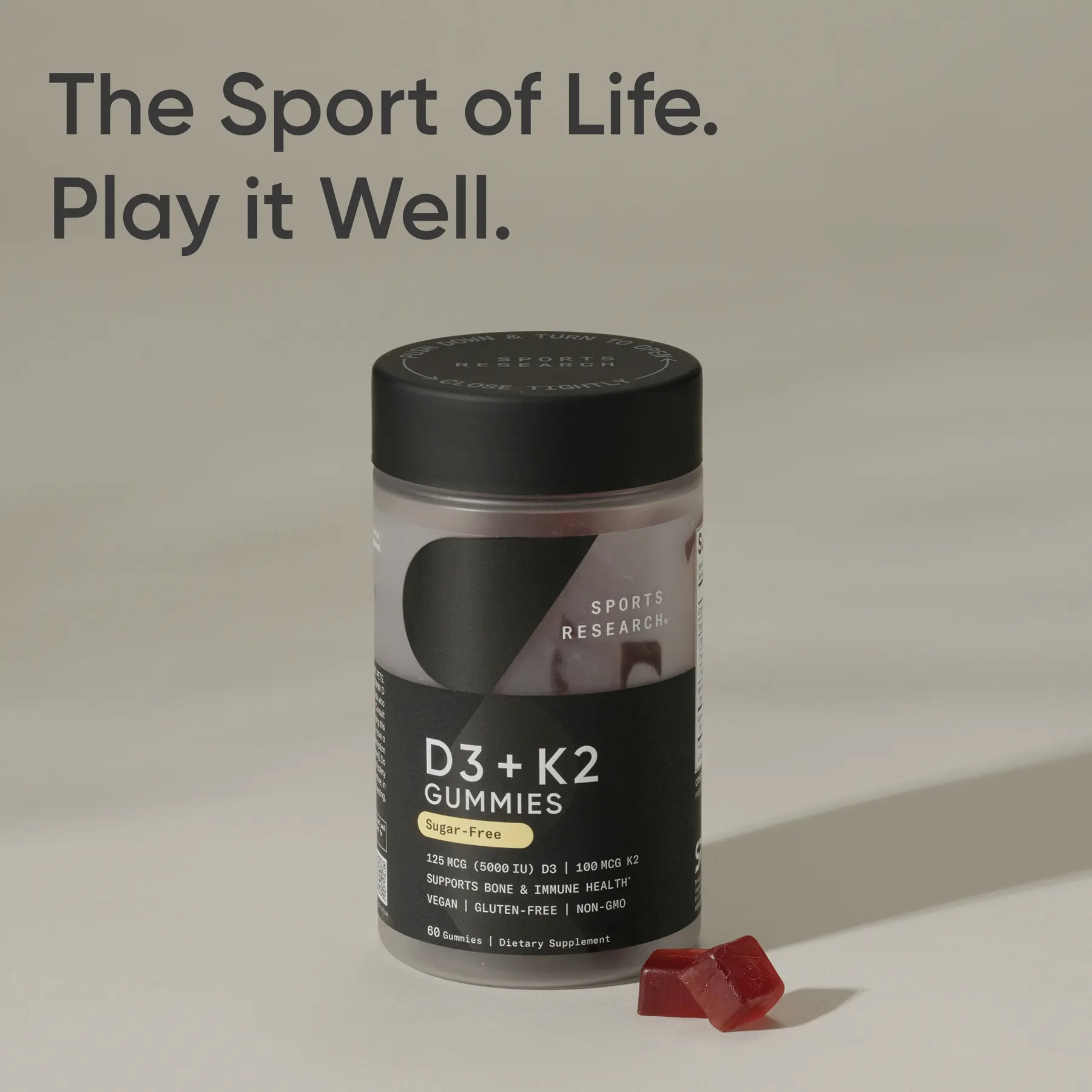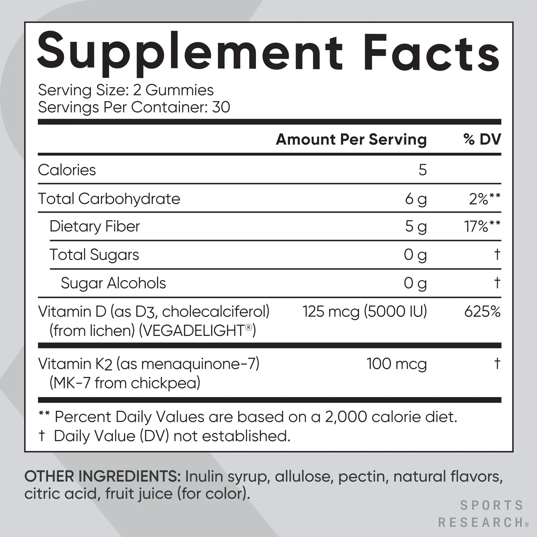 Strengthen your bones and immune system with the one and only Sports Research® Vitamin D3 + K2, now in a delicious *gummy form. This sugar free and sugar alcohol free formula combines VegaDELight™ Vegan D3 from lichens and K2 from chickpeas in delicious, chewable gummy to supplement your daily intake of D & K essential micronutrients.*