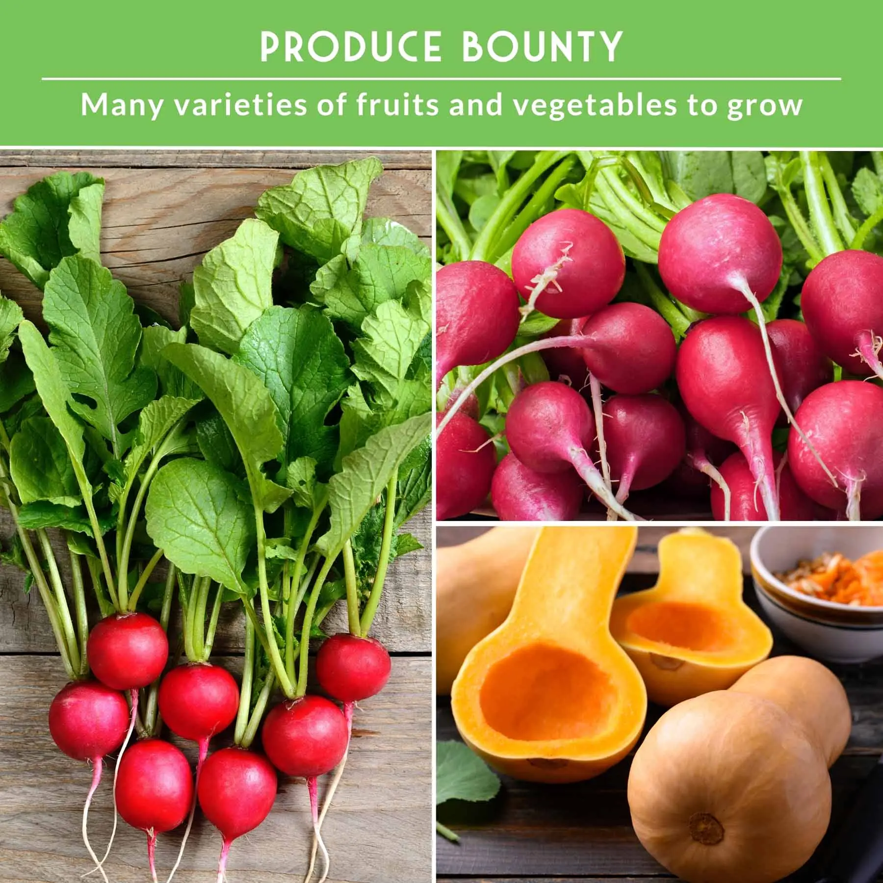 ·Produce Bounty - Many varieties of herbs, fruits, and vegetables to grow, including tomatoes, peppers, cruciferous vegetables, herbs, melons, carrots, beets, radishes, greens, okra, squash, cucumbers, and more.