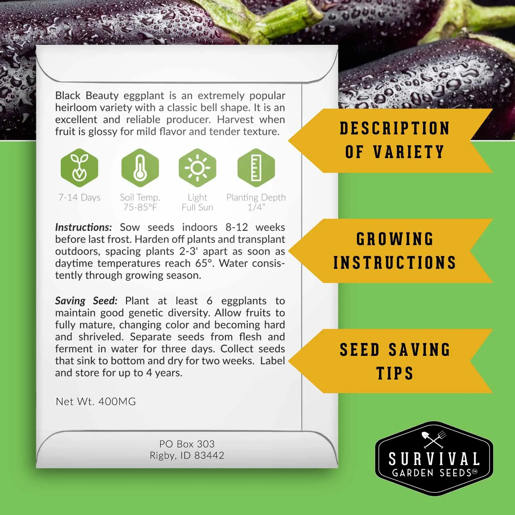 Included varieties:  Detroit Dark Red Beet, Golden Acres Cabbage, Imperator 58 Carrot, Golden Bantam Sweetcorn, National Pickling Cucumber, Black Beauty Eggplant, Large Red Cherry Tomato, Beefsteak Indeterminate Tomato, Butternut Squash, Straightneck Summer Squash, Crimson Sweet Watermelon, Black Beauty Zucchini, Cherry Belle Radish, Parris Island Lettuce, and Dwarf Siberian Improved Kale. Each variety is packaged in its own packet with instructions for planting and seed storage for ongoing survival garden needs.