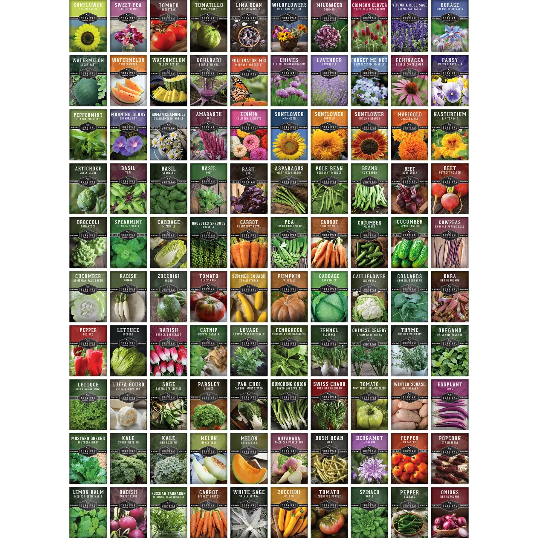 A diverse array of seeds grown and cultivated in the USA for planting in warm weather. Each packet of non-GMO seeds has instructions for seed storage and growing for long-term survival. The kit includes a variety of produce such as Red Amaranth, Green Globe Artichoke, and more.
