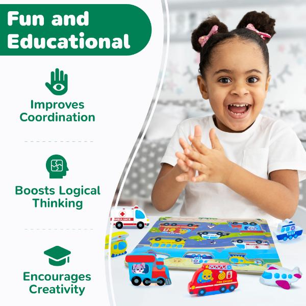 Let your toddler explore cars, trucks, and more with this fun Wooden Vehicle Puzzle by Lucas & Friends - a colorful and engaging wooden toy for kids! 🚌🚁 This toddler puzzle features 8 jumbo vehicle pieces including a fire truck, police car, airplane, train, school bus, ambulance, boat, and helicopter.