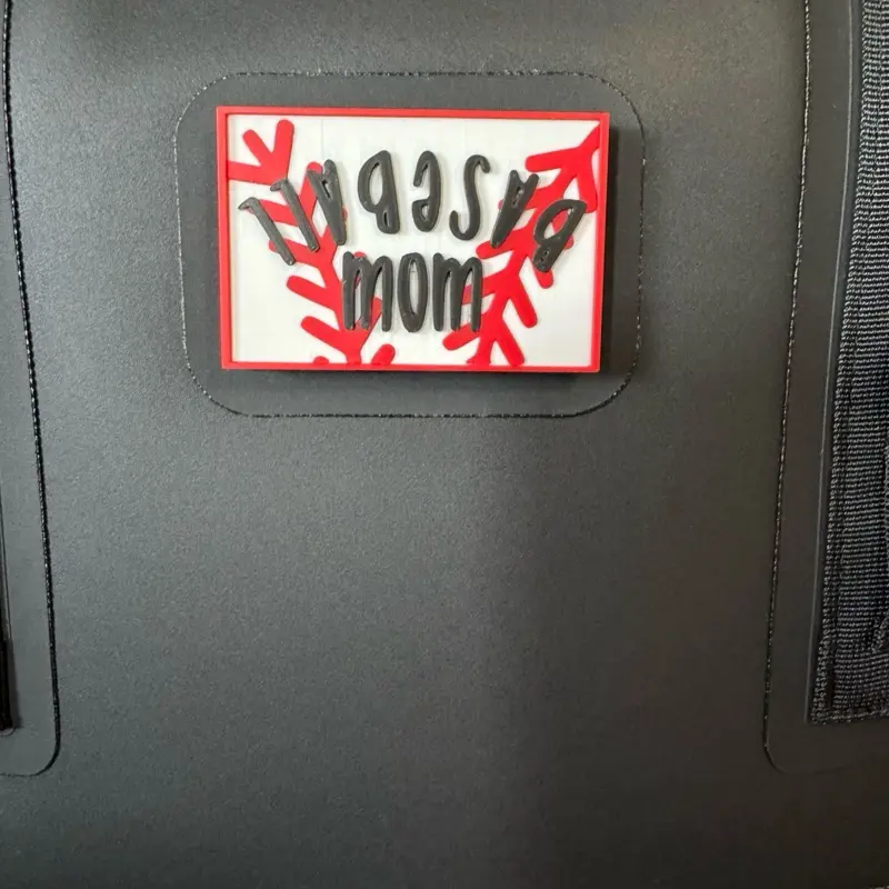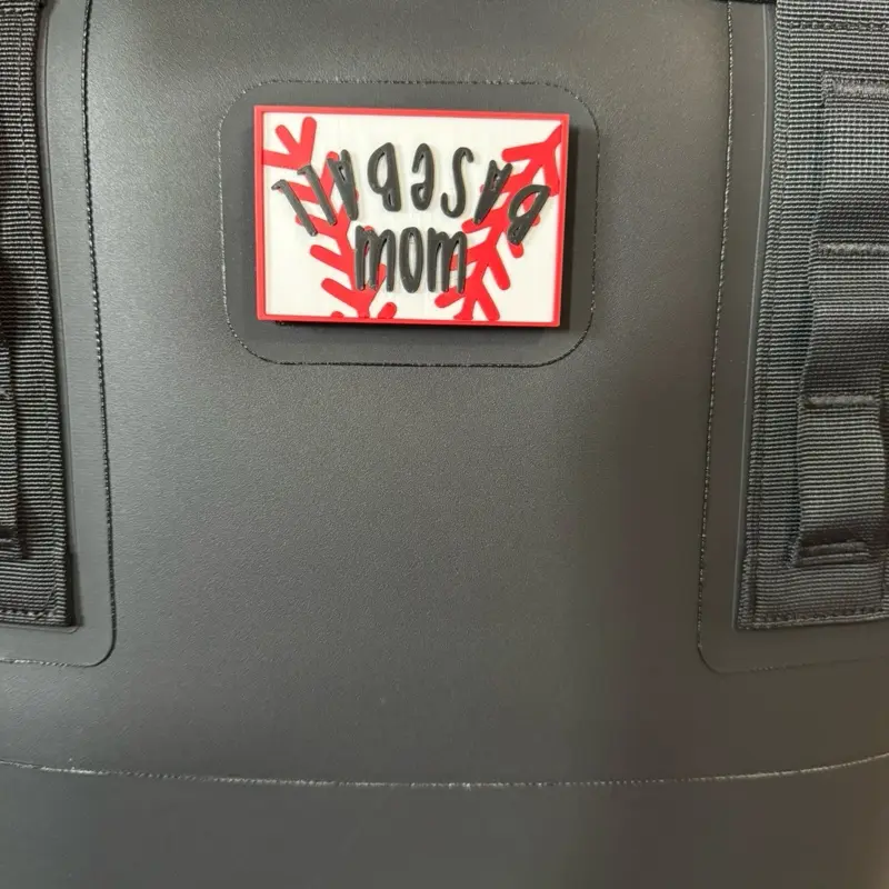2”x3” baseball Mom Velcro bag / tote patch with adhesive Velcro hook piece on back to stick to bags with loop pieces