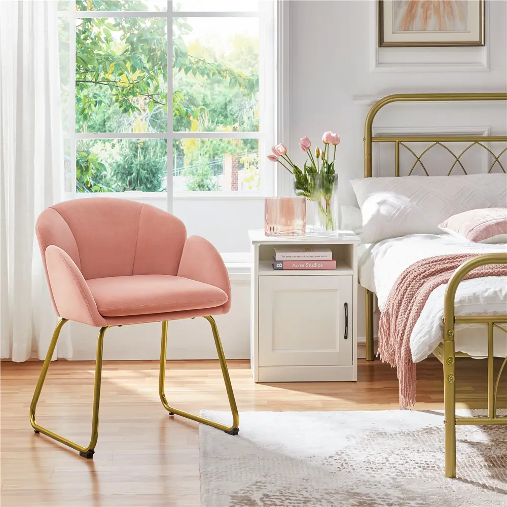Want an unusual dining chair to decorate your kitchen? Need a contemporary living room chair to light up your room? Choose this upholstered accent chair with a blooming flower design. It's made of a solid manufactured wood frame, gold-tone metal legs and soft-to-touch velvet upholstery, providing excellent stability and durability. Soft padded with thick high-density foam, this armchair offers an ideal spot for you to work, dine or relax. The flared backrest flawlessly fits your back, providing just-right body support for longer sittings. The padded, round armrest flawlessly lines up with your arms, making you more relaxed while sitting. The compact size and lightweight design make this side chair ideal for living rooms, kitchens, bedrooms, offices, apartments, and other small spaces.