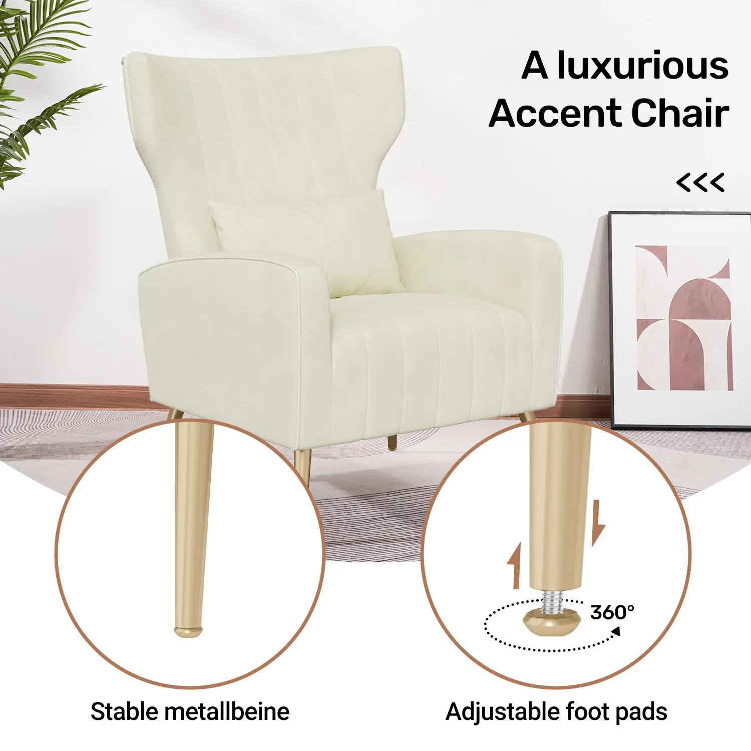 ·【COMFORTABLE MATERIAL】:Crafted from premium materials for last-using. The soft cushion of living room chair is made of high density elastic sponge.The robust wood frame and sturdy metal legs of our decorative chair ensure durability and stability.