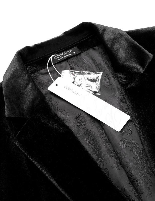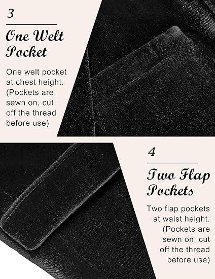 ·FUNCTIONAL POCKETS - This velvet blazer jacket features one welt pocket at chest height and two flap pockets at waist height(Pockets are sewn on, please cut off the thread before use), easy to hold small items like earphone, wallets, keys, coins and so on.