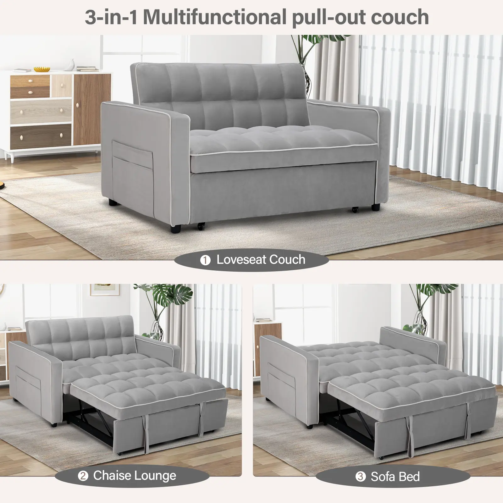 ·Versatile 3-in-1 Design: This convertible sofa bed effortlessly transforms from a stylish loveseat to a comfortable lounge sofa and a convenient pullout sofa bed. Its multifunctional design makes it perfect for small spaces and versatile living arrangements.