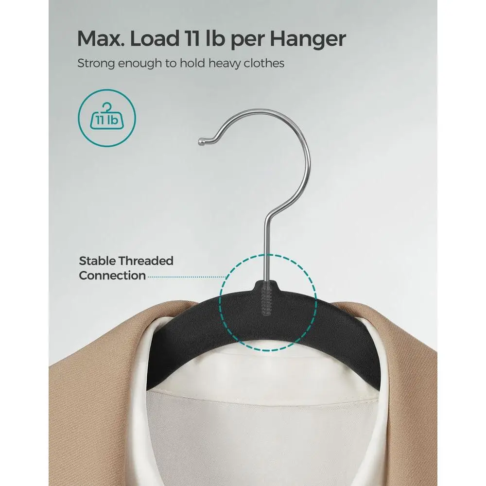 Our velvet hangers offer the perfect combination of style and function. Not only do these hangers have a stylish appearance, but they also offer space-saving benefits with their slim design and ability to hold a max load of 11 lb (5 kg). What’s more, shoulder notches securely hold your clothes with straps, preventing them from slipping off the hanger.