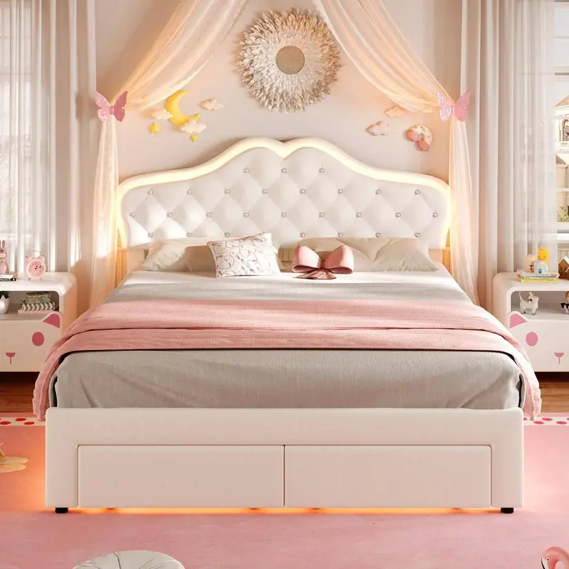 This full bed frame with 2 large storage drawers, silent-glide drawer at the footboard for easy storage. With 7 inches of clearance on each side, this full bed frame girls offers extra space for storage and easy cleaning, plus the air circulation keeps the mattress fresher for longer