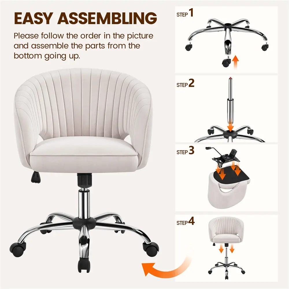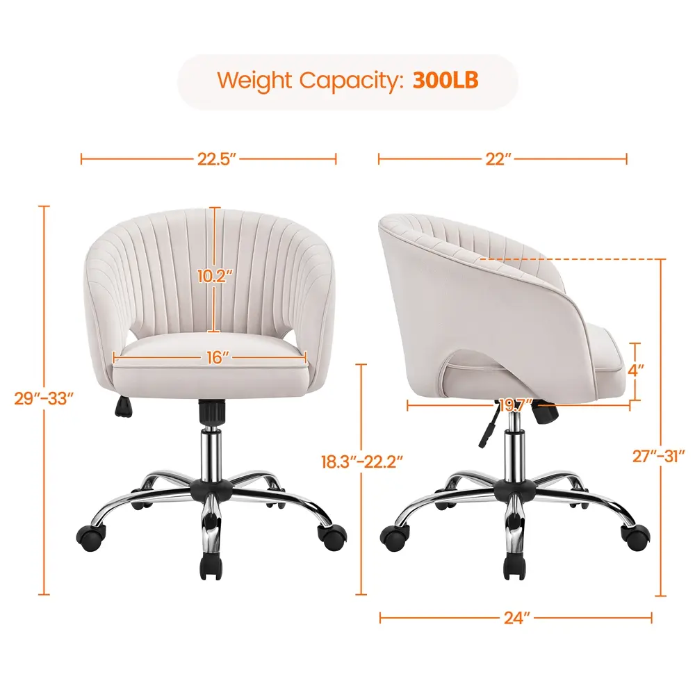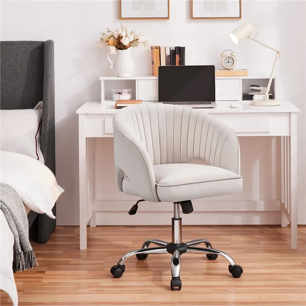 1. Sturdy and Comfortable: This home office chair combines a sleek design with strength. Its chrome base, SGS-certified gas lift, and caster wheels support up to 300 lbs. The soft velvet fabric and high-density foam offer great comfort.