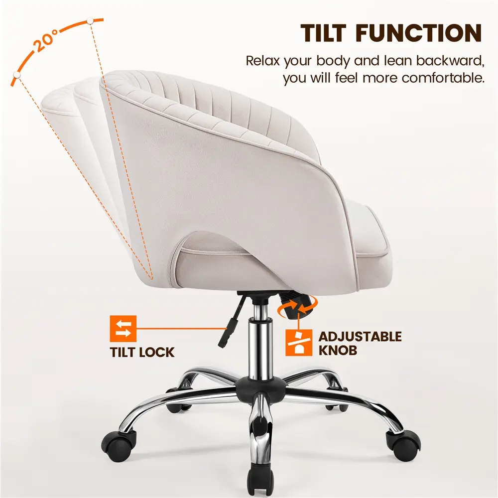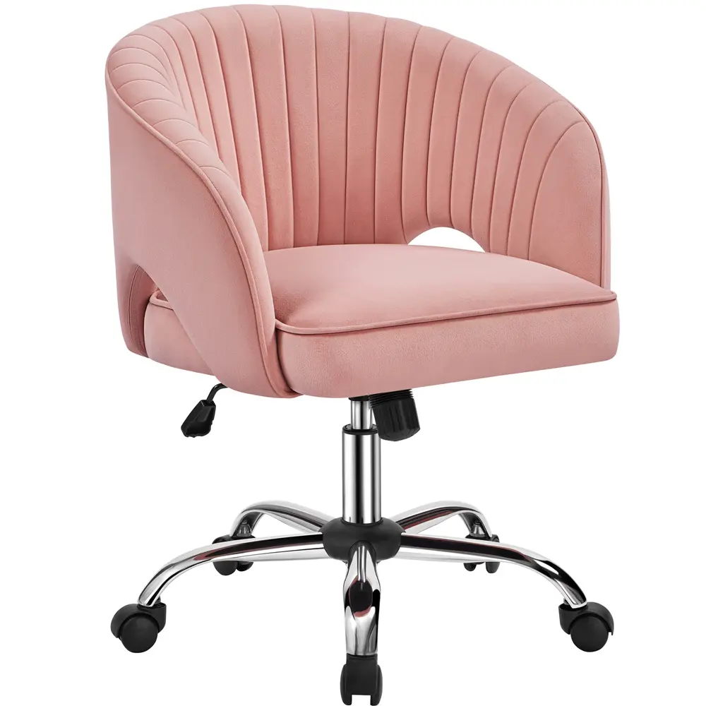 2. Comfy Mid Back Chair: The chair features a thick foam seat covered in soft velvet fabric. The padded, barrel-shaped backrest supports your back and relieves pressure, while the cutouts improve airflow. The curved armrests provide extra comfort.