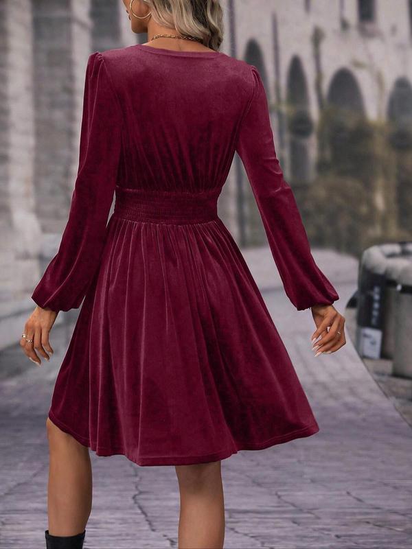 Velvet V Neck Long Sleeve Waist Cinching Solid Color Party Dress Skirt, Perfect for Spring & Fall Valentine's Day, Versatile Elegant Short Skirt