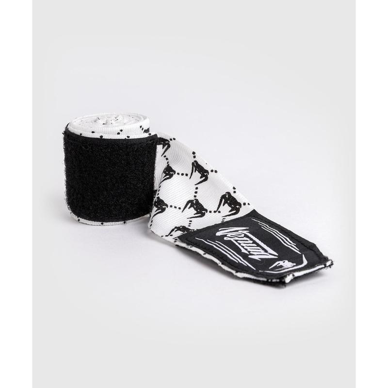 Essentials for combat sports - with a punch of color. Venum Hand Wraps are made with elasticated cotton, offering just the right amount of stretch. The thumb hoop and hook-and-loop closure offers secure wrapping so you can focus on your next strike. The white and black colorway features a repeated sublimated Venum logo along the wrap, with a branded patch at the closure. Suitable for boxing, Muay Thai, MMA and other combat sports.