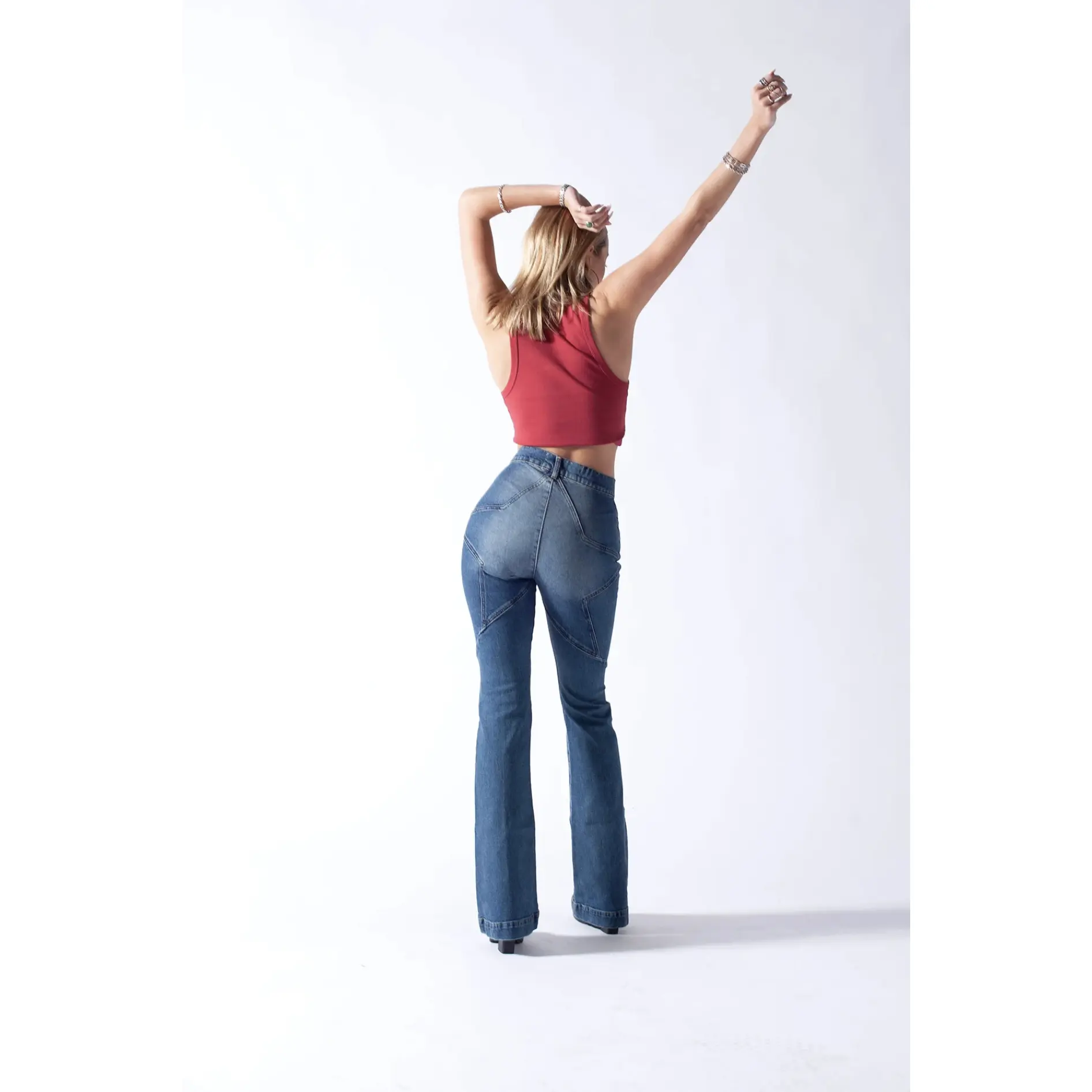 DETAILS 33 1/2" inseam 22" Flare Opening High-Waisted Star Silhouette Front Pleat Detail Premium Quality Cone Mills Fabric Comfort Stretch Denim 98% Cotton, 2% Elastane