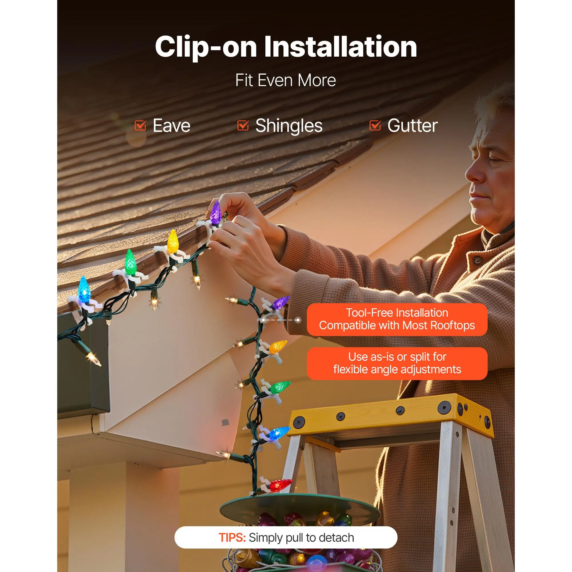 • Easy & Quick Installation: No tools required! The clip-on design allows you to quickly mount the Christmas light gutter clips to eaves, shingles, or gutters. Split and combine for flexible angle installations. No screws or tape needed