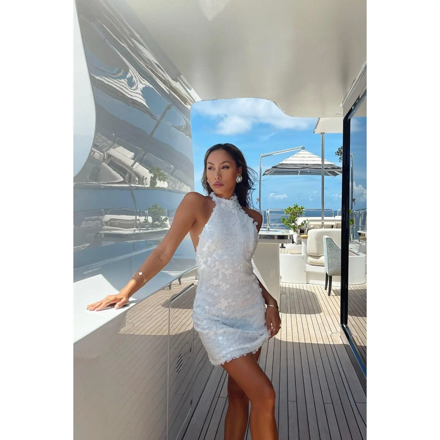 Ring in some sparkle and shine with the Vera White Payette Mini Dress. Featuring a chic high neck and sparkling payette texture, it's a stunning choice for bridal parties and glamorous evenings out.