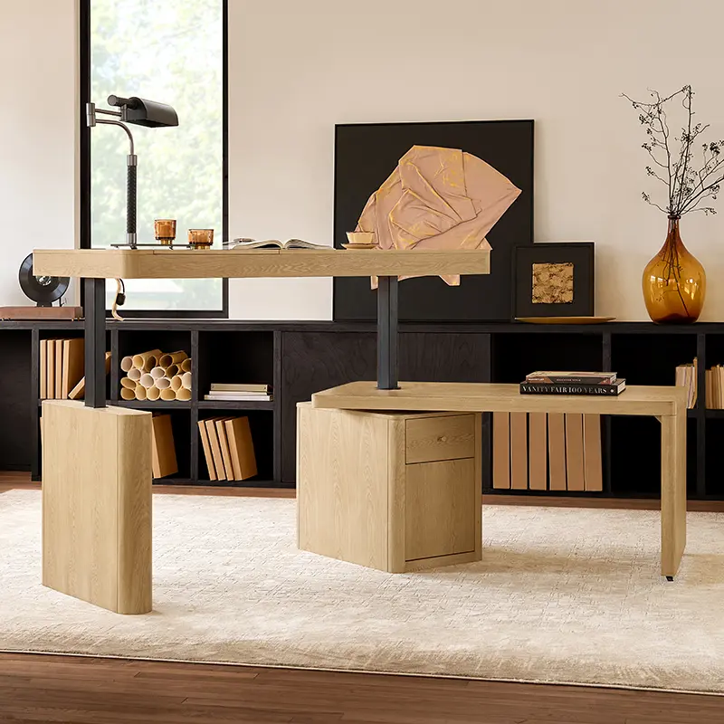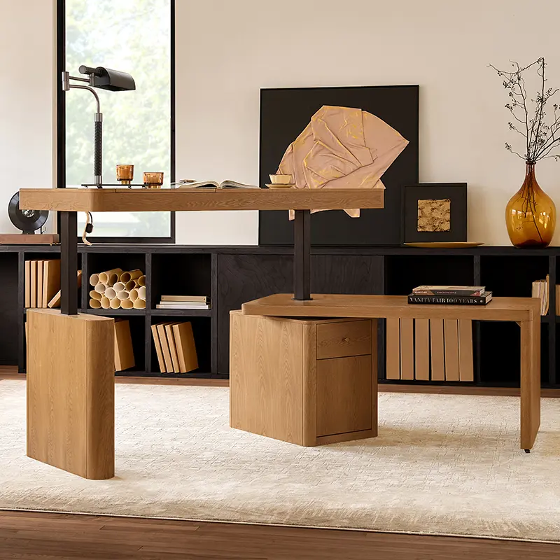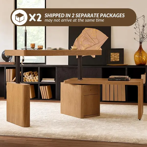 This modern electric height-adjustable desk offers versatility and comfort. The main desktop adjusts to your preferred height, promoting a healthier posture. Beneath the surface, two genuine drawers are available, with the right drawer featuring a faux front for a decorative look.