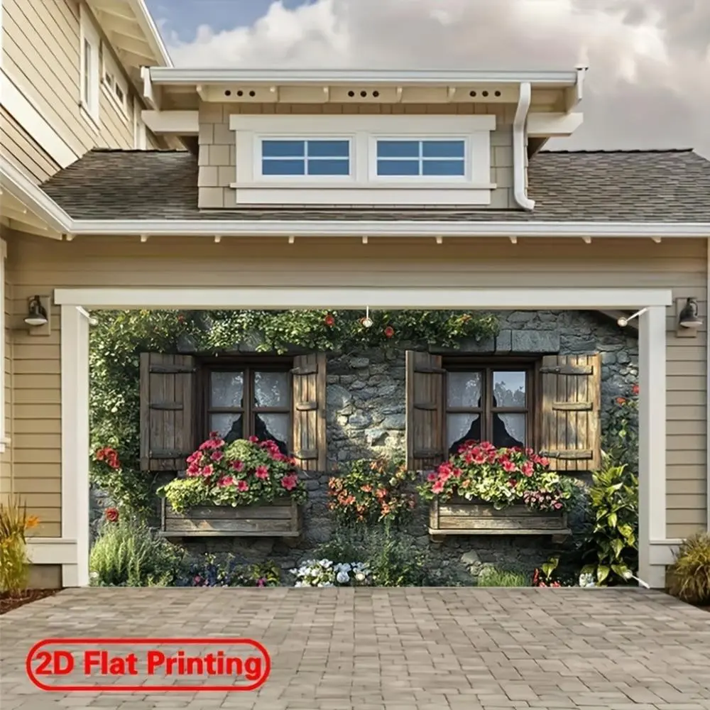 2D Flat - 2D Door Banner 1pc 2D Flat Large Polyester Garage Door Banner | Stone Wall and Colorful Floral Theme Design, Suitable for Festival, Courtyard, Studio, Home and Garden Celebrations, M