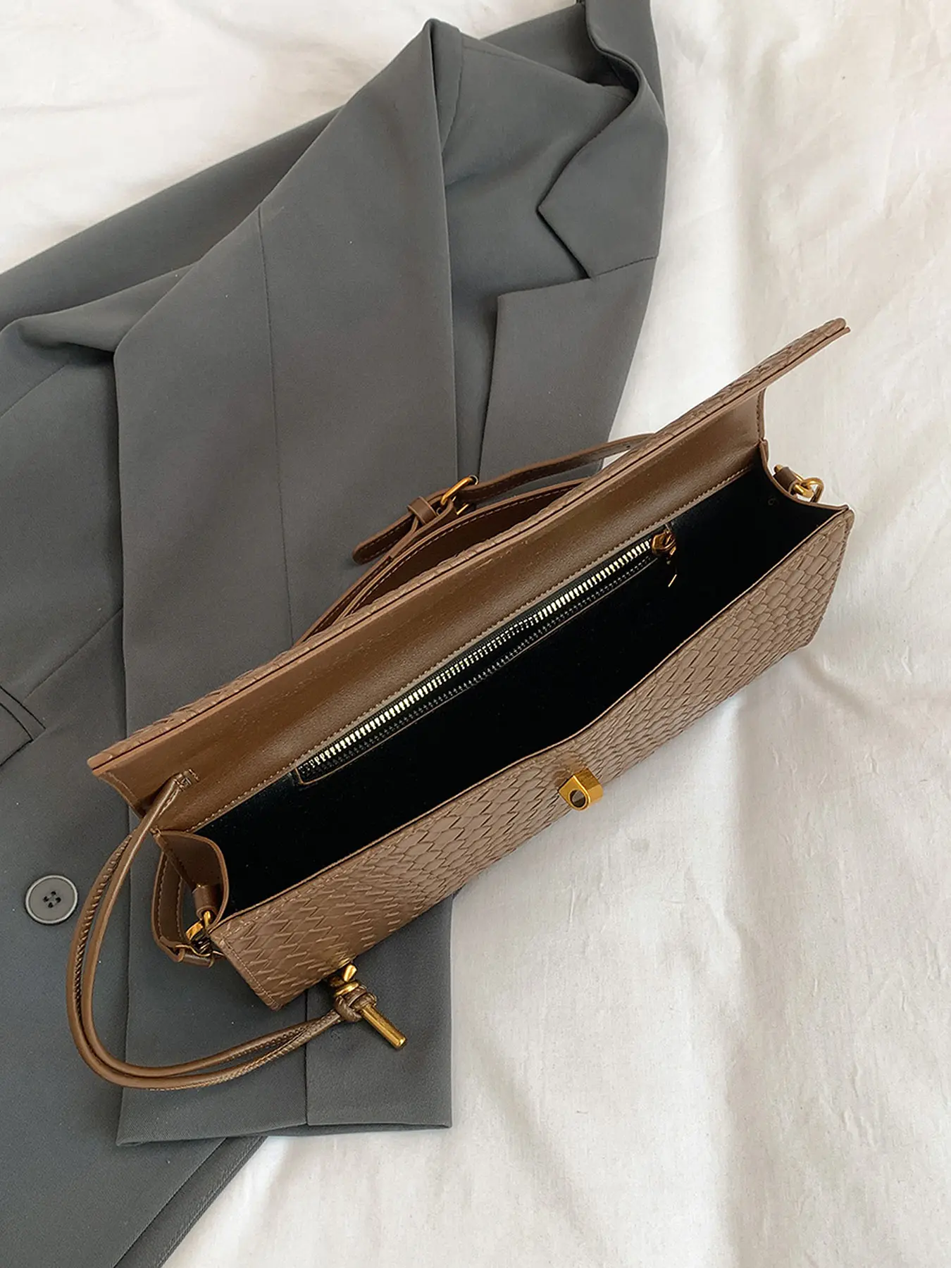 cute bag for the money but it’s not actually woven pu it’s stamped so it does look a little cheap up close