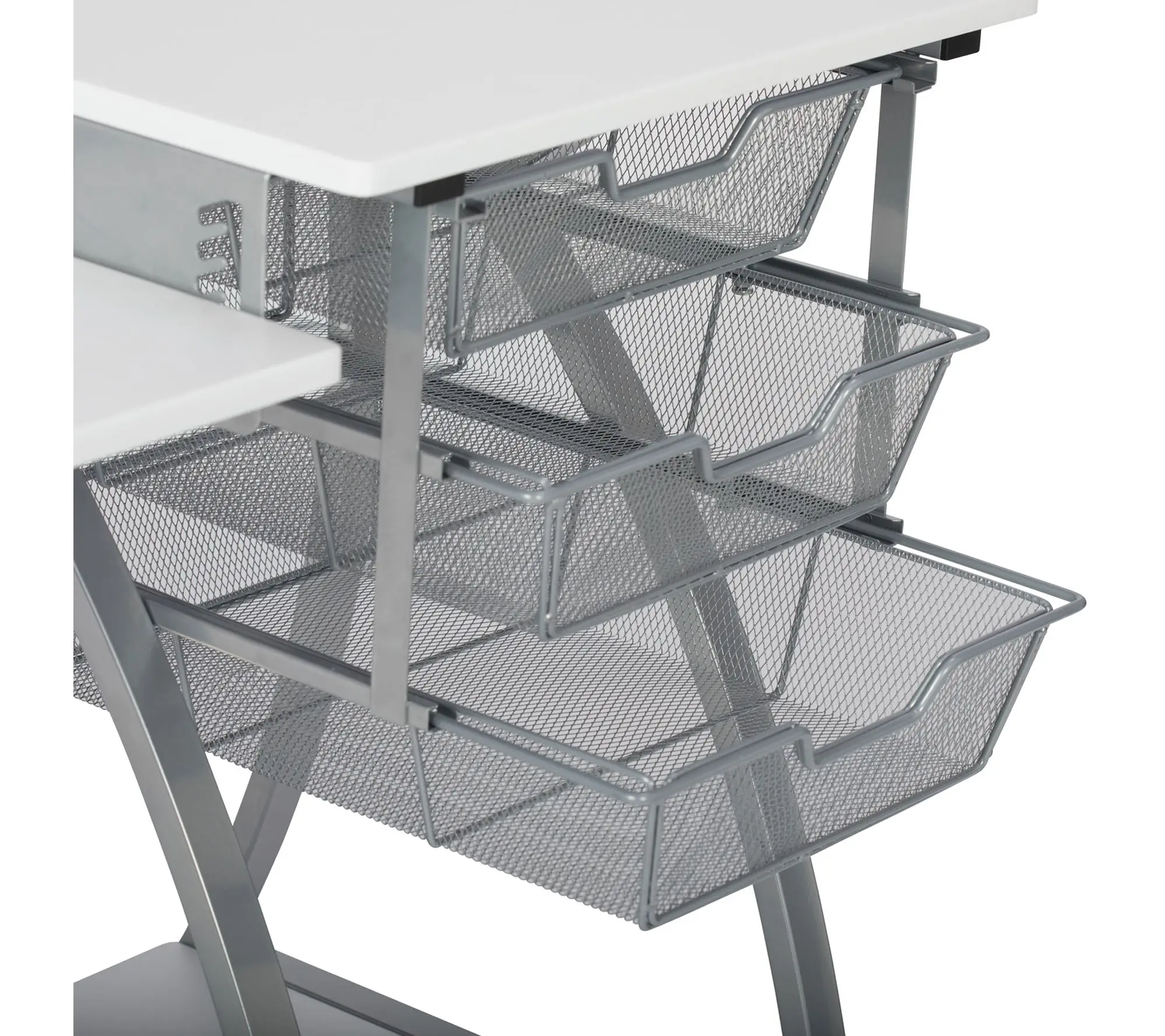 ·Features large 56.75" tabletop, foldable 9.5" wide shelf, adjustable platform shelf for various sewing machine heights, three metal mesh drawers, large lower storage shelf, right lower storage shelf, and 2" cord hole for cable management