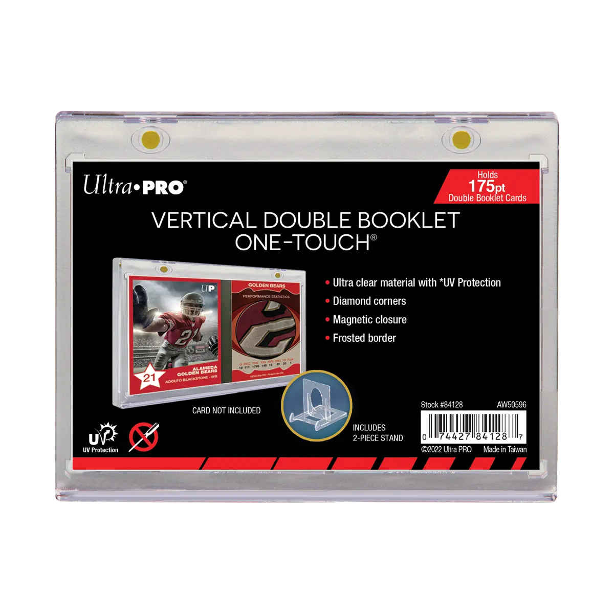Ultra PRO's ONE-TOUCH® holders are premium trading card storage cases designed as the final destination for your booklet cards, our two-piece ONE-TOUCH® holders are uniquely designed with a slide-in hinge and double-tight magnetic closure. The holder provides UV-resistant, no-PVC, and acid-free protection to ensure your valuable hit retains its condition while under the display. Our ONE-TOUCH® booklet holder comes with a minimalist two-piece display stand with an adjustable viewing angle. This model can hold vertical booklet cards.