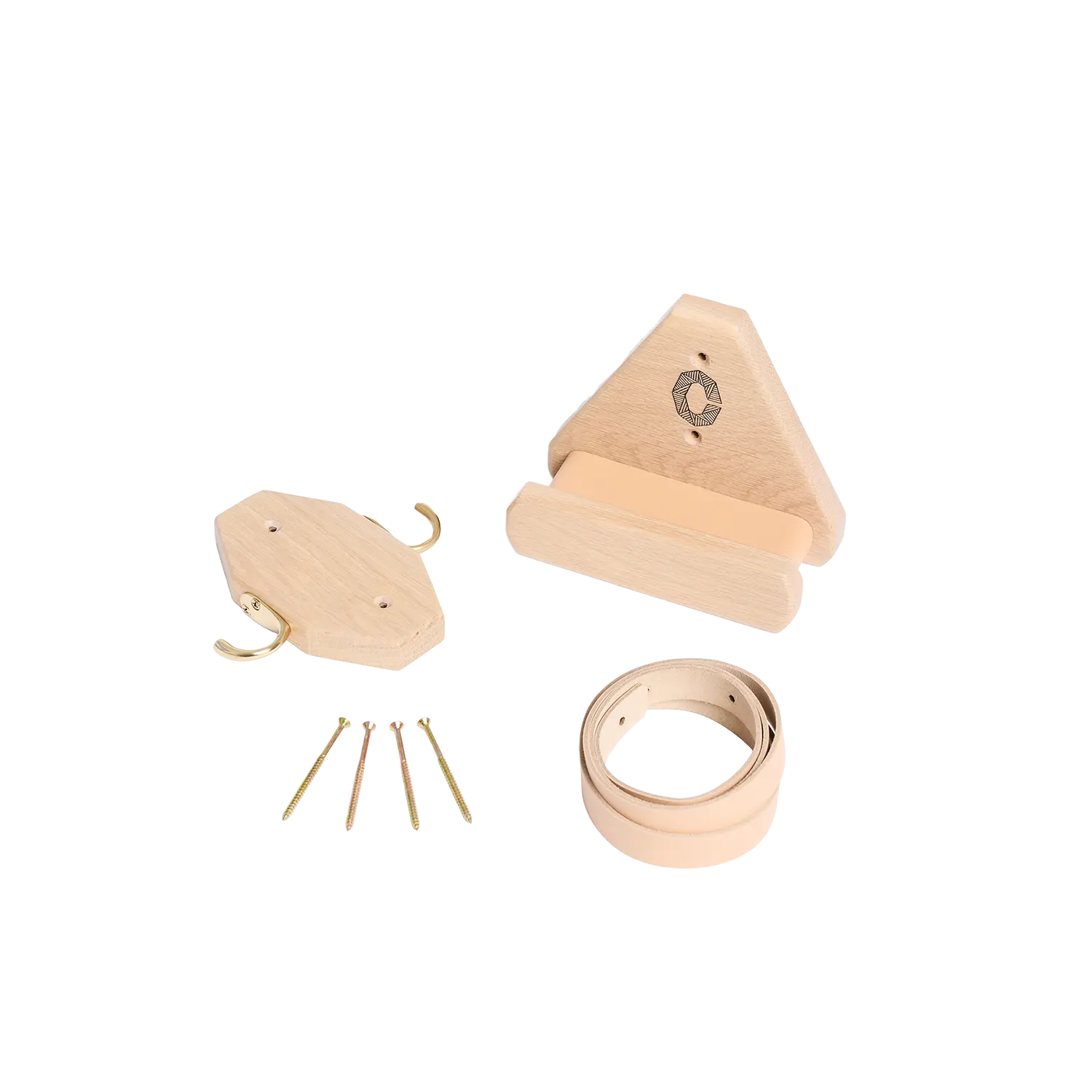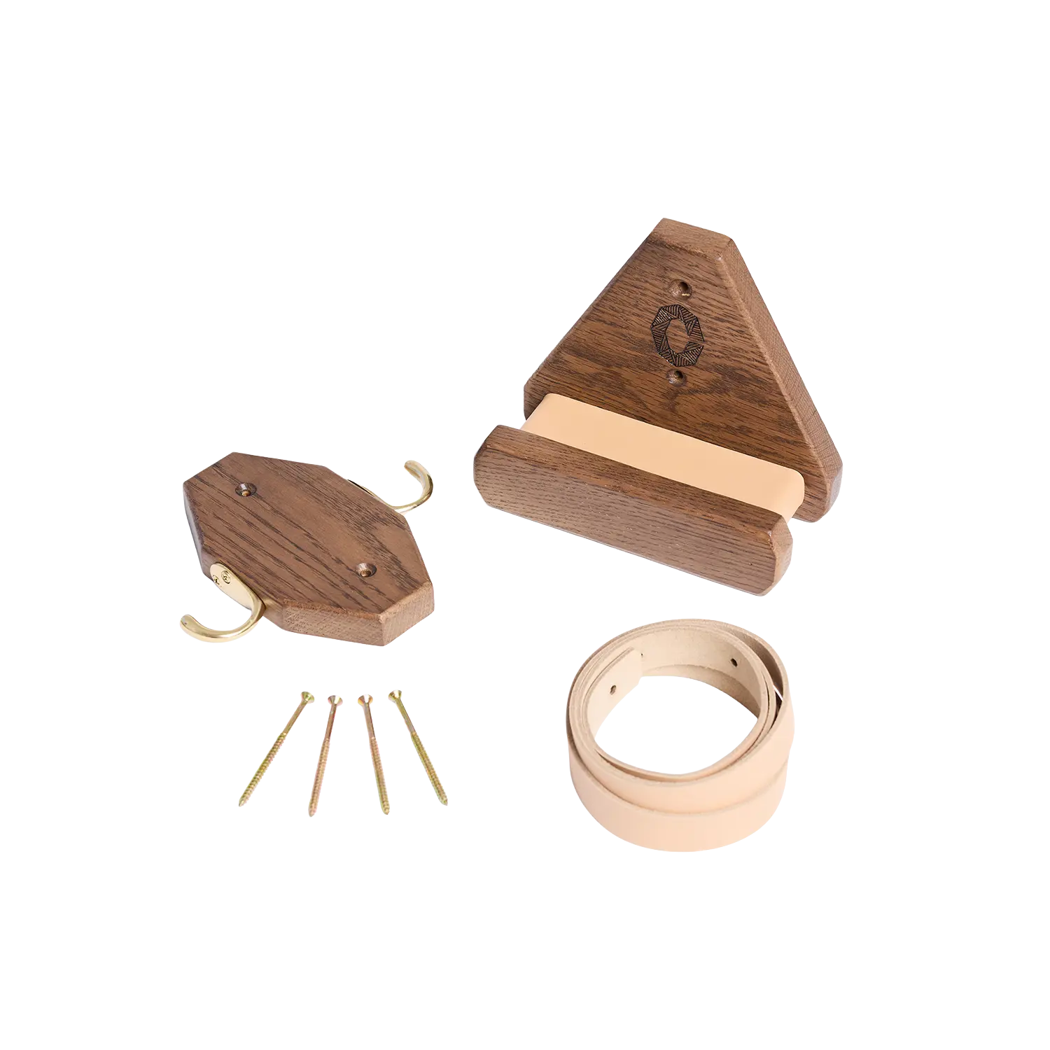 This is designed to display a board with the bottom facing outward. The tail rests on the wooden block, and the leather strap is adjustable to hold the board firmly in place.
