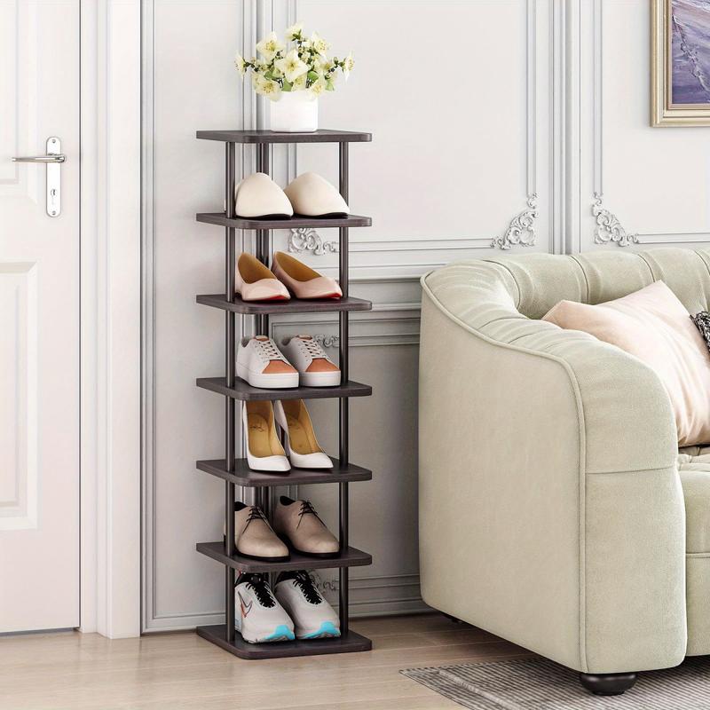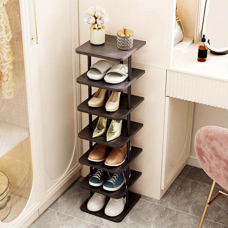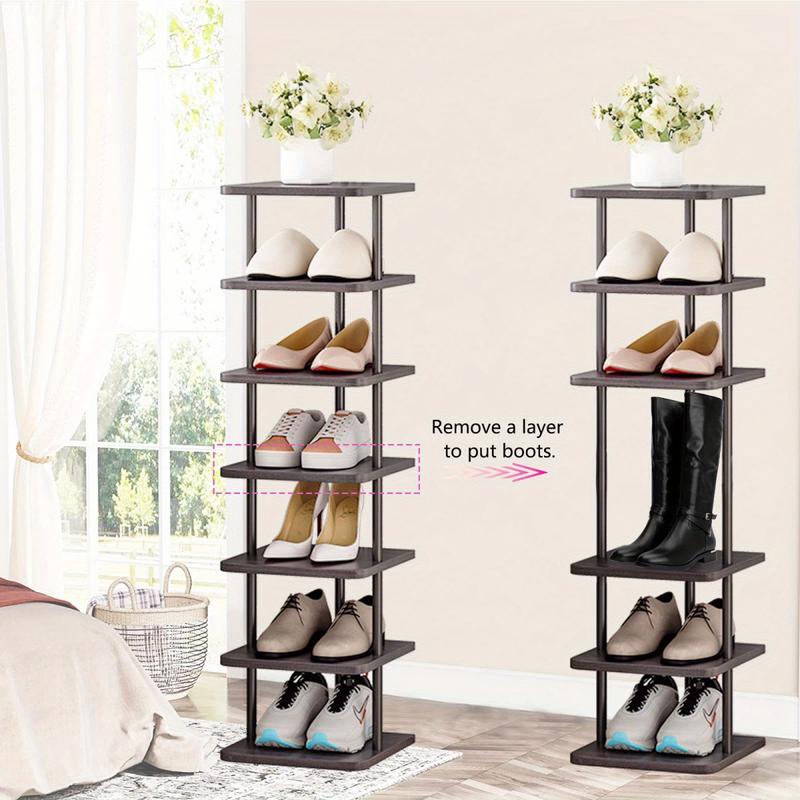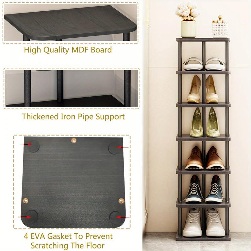 [7 Tier Shoe Rack]This vertical shoe rack can hold a variety of shoes, such as sneakers, slippers, boots, high heels, etc., making your entryway, closet,dormitory,garage neater and more beautiful.[Multifunctional]Elegant black and smooth MDF boards make up this piece of art, it is not only a shoe rack, but can also be used as a storage rack or display stand to store daily items such as books, photo frame, plants, CDs, decorations etc.Add a delightful corner to your home.[Sturdy And Durable Material]Using thickened iron pipe to ensure the stability of the entire shoe rack, so it is very textured and very durable, it will serve you for many years.[Easy To Assemble]Simple accessories and clear instructions allow you to easily install the shoe rack in minutes without additional tools.