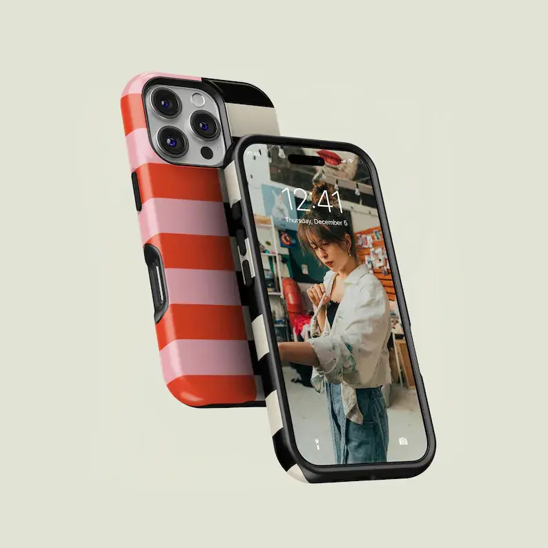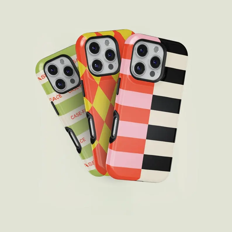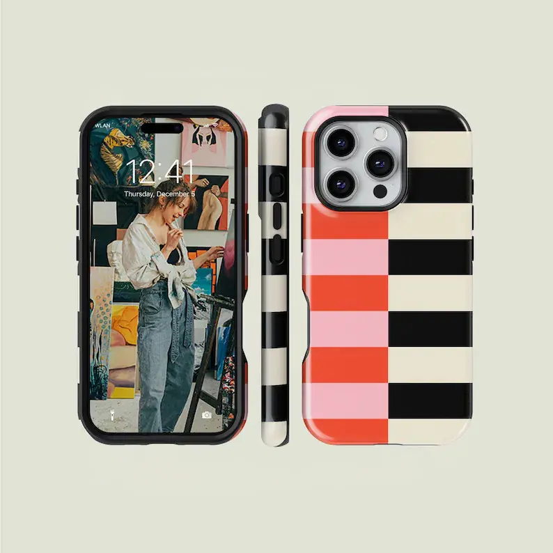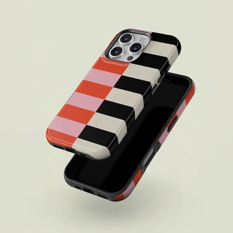 Vertical Split Striped Light Pink, Bright Orange, Black & Cream iPhone Case Compatible with iPhone 15 16 14 17 Pro Max 13 12 11 XR AIR XS Plus Cute Drop Protection Rugged and Durable gift for her men's cool gadgets iphone 17 pro max cases girls